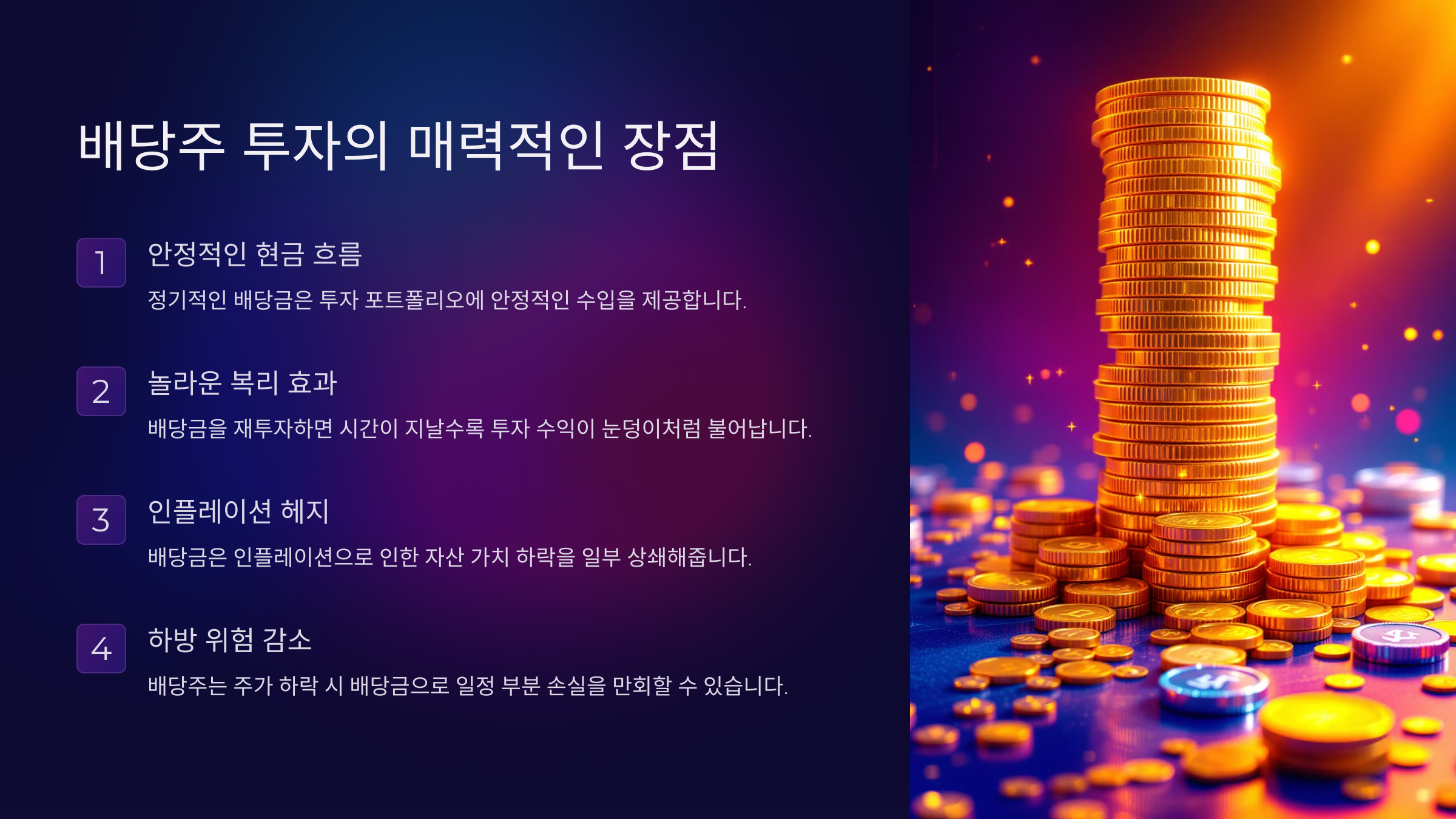 장점 설명 📈 안정적인 수익 배당금을 통해 꾸준한 현금흐름 확보 가능 🔄 복리 효과 배당금을 재투자하면 장기적으로 큰 수익 가능 📊 변동성 완화 주가 하락 시에도 배당 수익으로 손실 보전 가능 💰 인컴 투자 은퇴 후에도 배당금으로 생활비 마련 가능 📢 배당주 투자를 하면 좋은 이유
