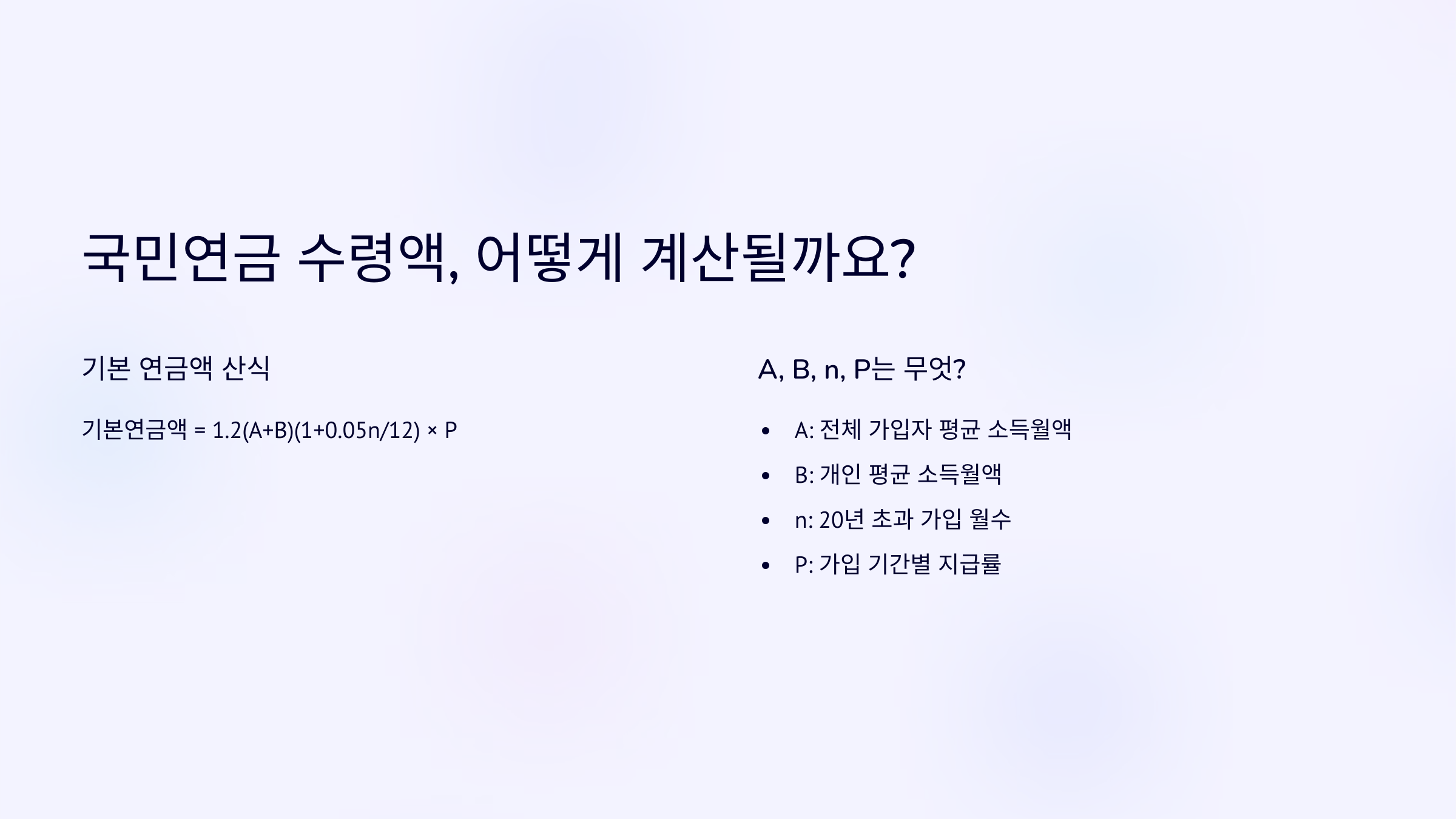 이 공식이 복잡해 보일 수 있지만, 쉽게 설명하면 개인의 가입 기간이 길고 소득이 높을수록 연금 수령액이 많아진다는 뜻이에요!