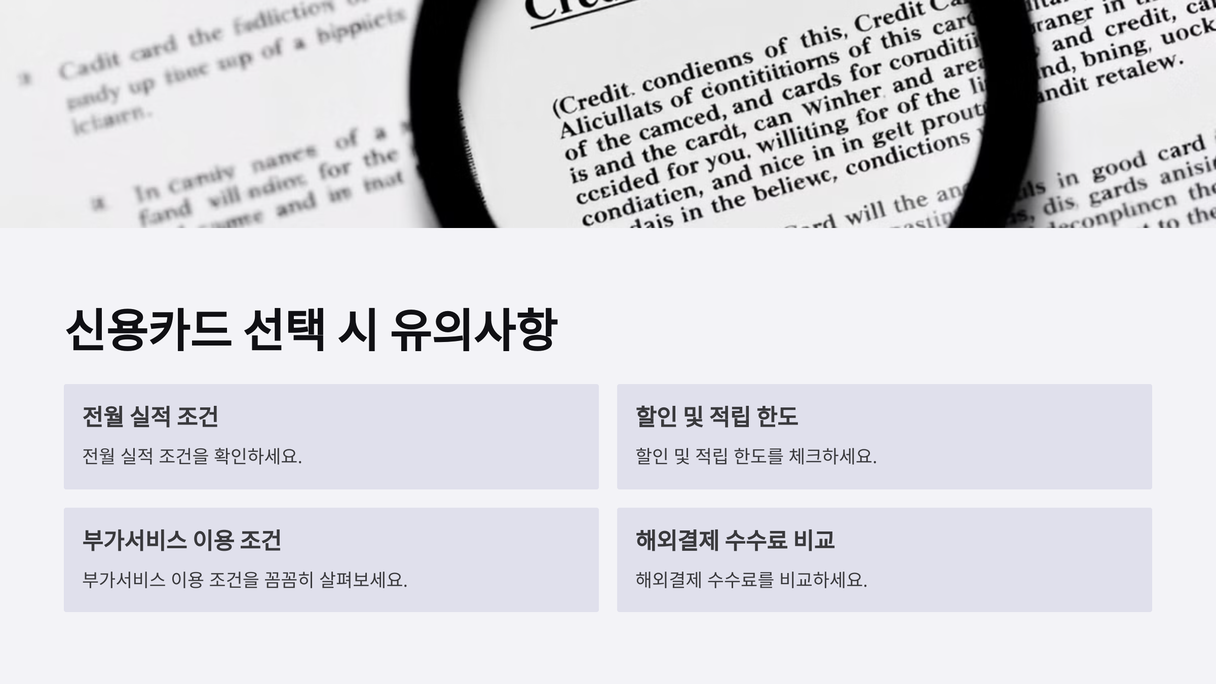 신용카드를 고를 때는 본인의 소비 패턴과 원하는 혜택을 고려하는 것이 중요해요. 🔎