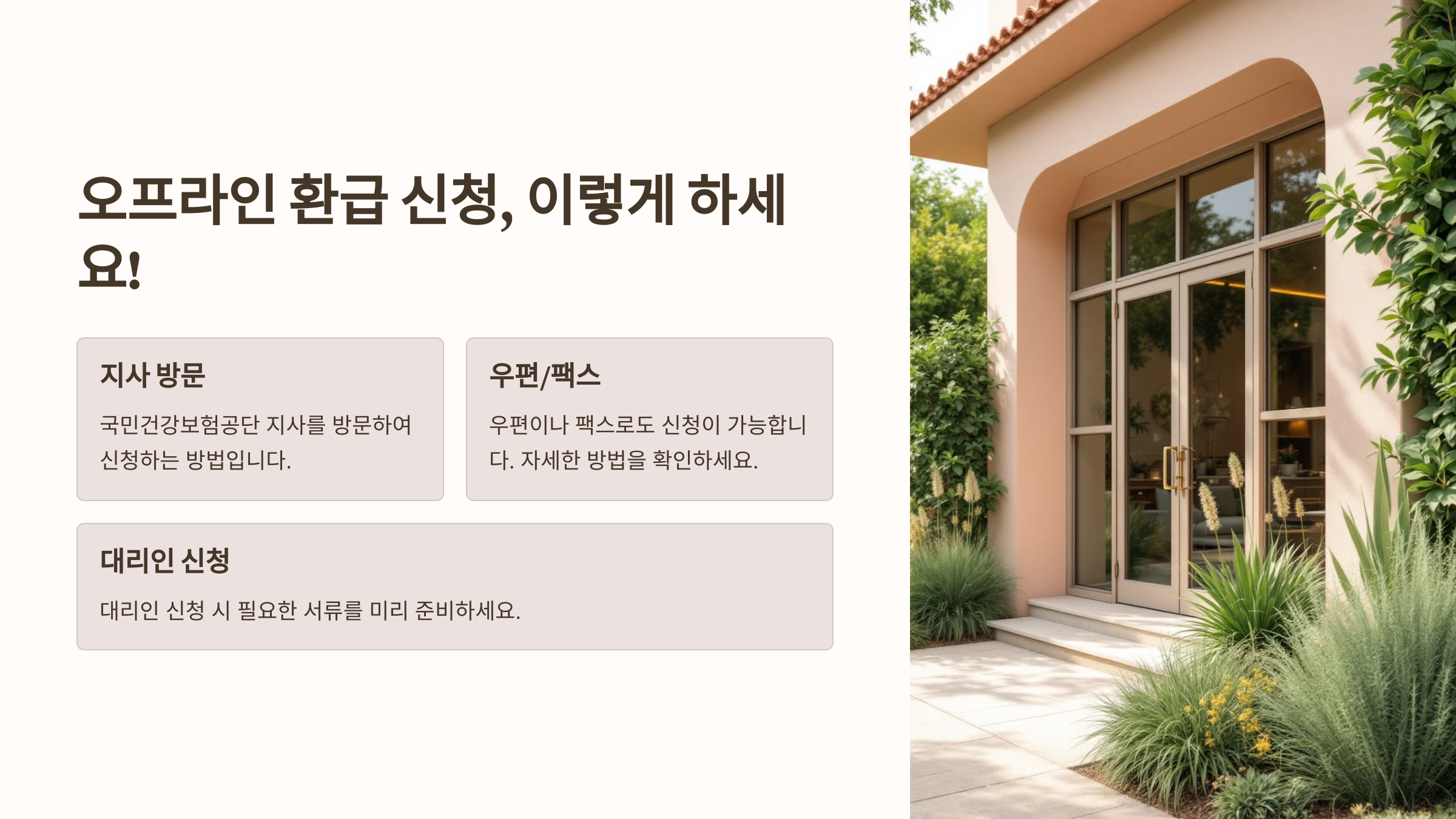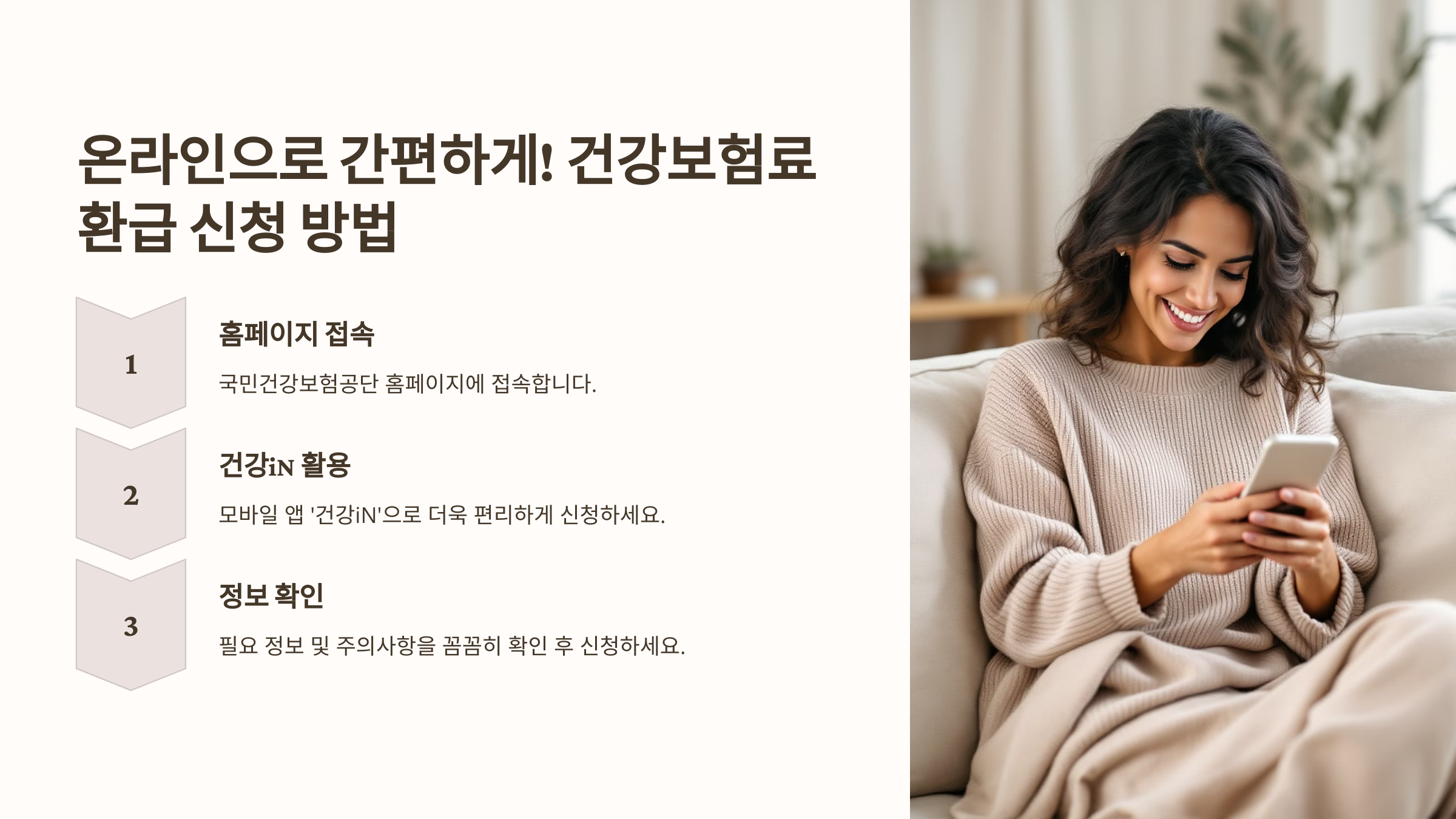 신청 방법 절차 💻 온라인 신청 국민건강보험공단 홈페이지(www.nhis.or.kr) 로그인 → ‘보험료 환급금 신청’ → 계좌 입력 후 신청 완료 📞 전화 신청 국민건강보험공단 고객센터(☎1577-1000)로 전화 후 본인 확인 절차 진행 → 계좌번호 제출 🏢 방문 신청 가까운 국민건강보험공단 지사 방문 → 신분증 및 통장 사본 제출 → 환급 신청서 작성 후 접수 📢 건강보험료 환급 신청 시 유의사항