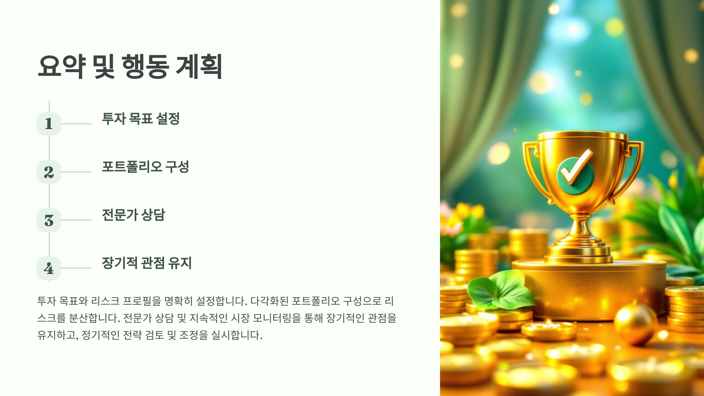 A8. 분산 투자, 시장 흐름 분석, 리스크 관리가 핵심이에요. 단기 고수익보다는 꾸준히 자산을 불리는 전략이 안전하고 효과적이에요. 🚀