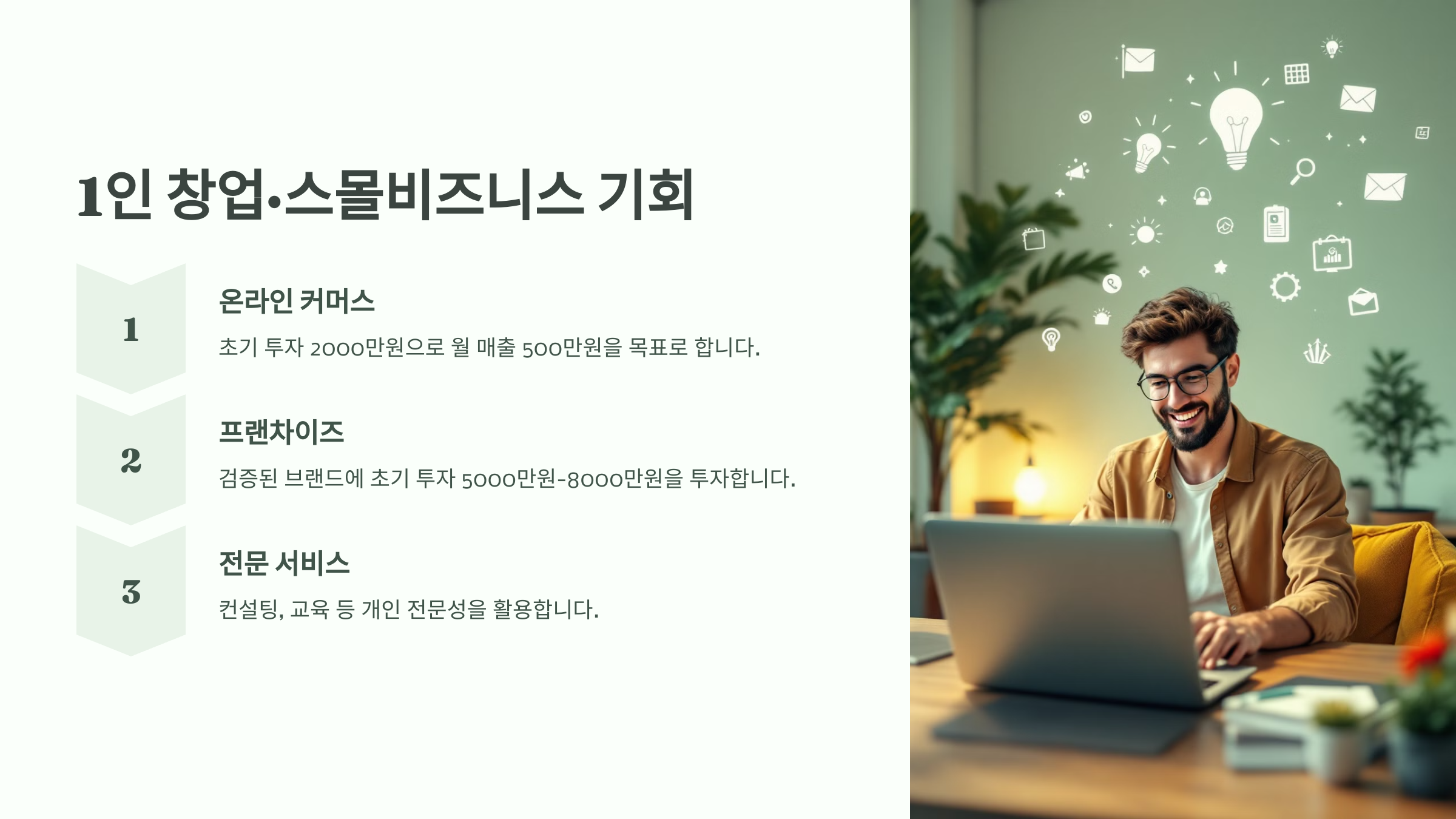 특히, 온라인 비즈니스, 무인 매장, 프랜차이즈, 1인 기업은 초기 자본이 적고 수익성이 높은 분야예요. 🚀