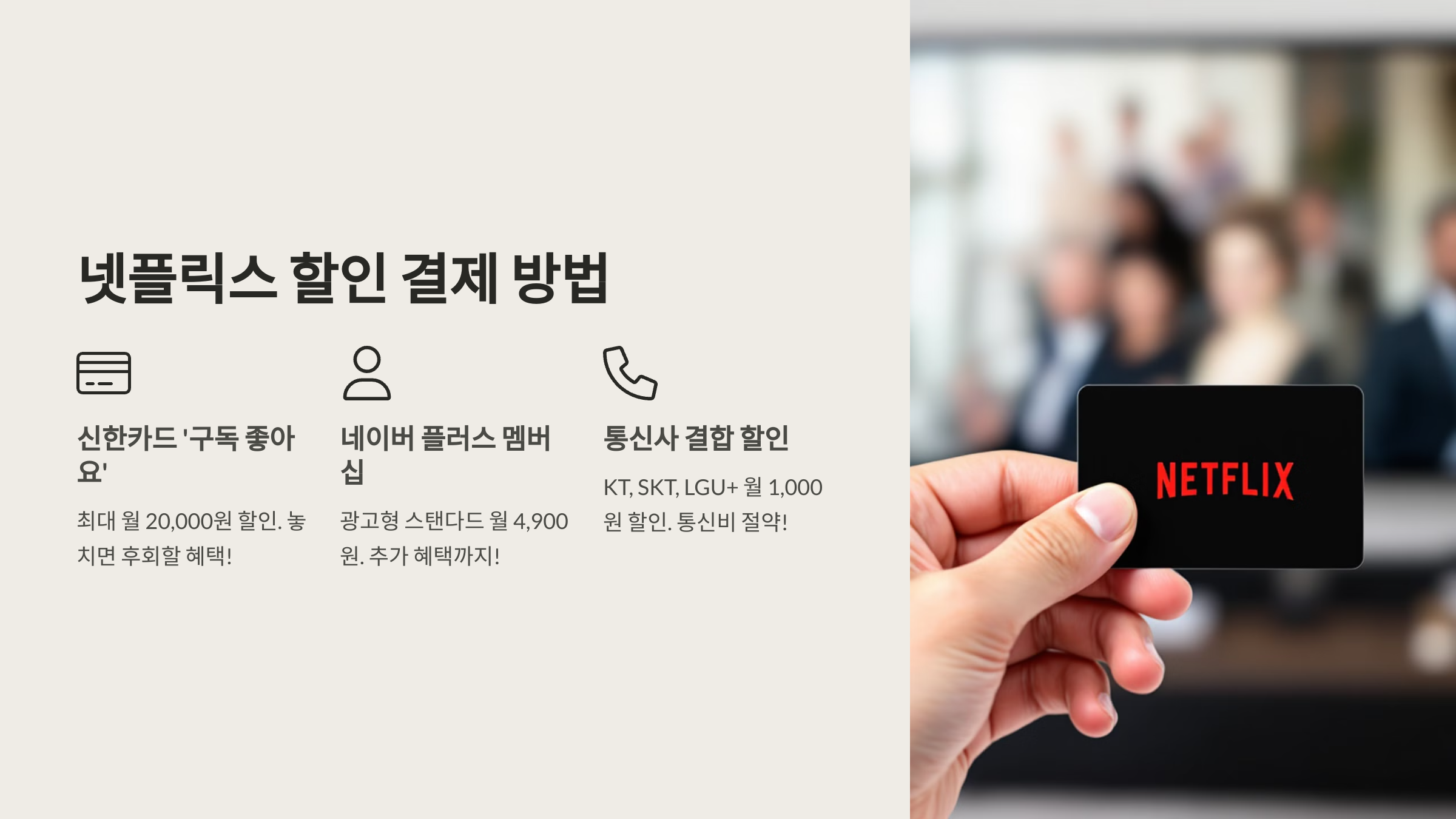 넷플릭스를 정가보다 싸게 결제할 수 있는 방법이 많아요! 할인 카드를 활용하거나 해외 결제를 이용하면 최대 50%까지 저렴하게 구독할 수 있어요. 💰