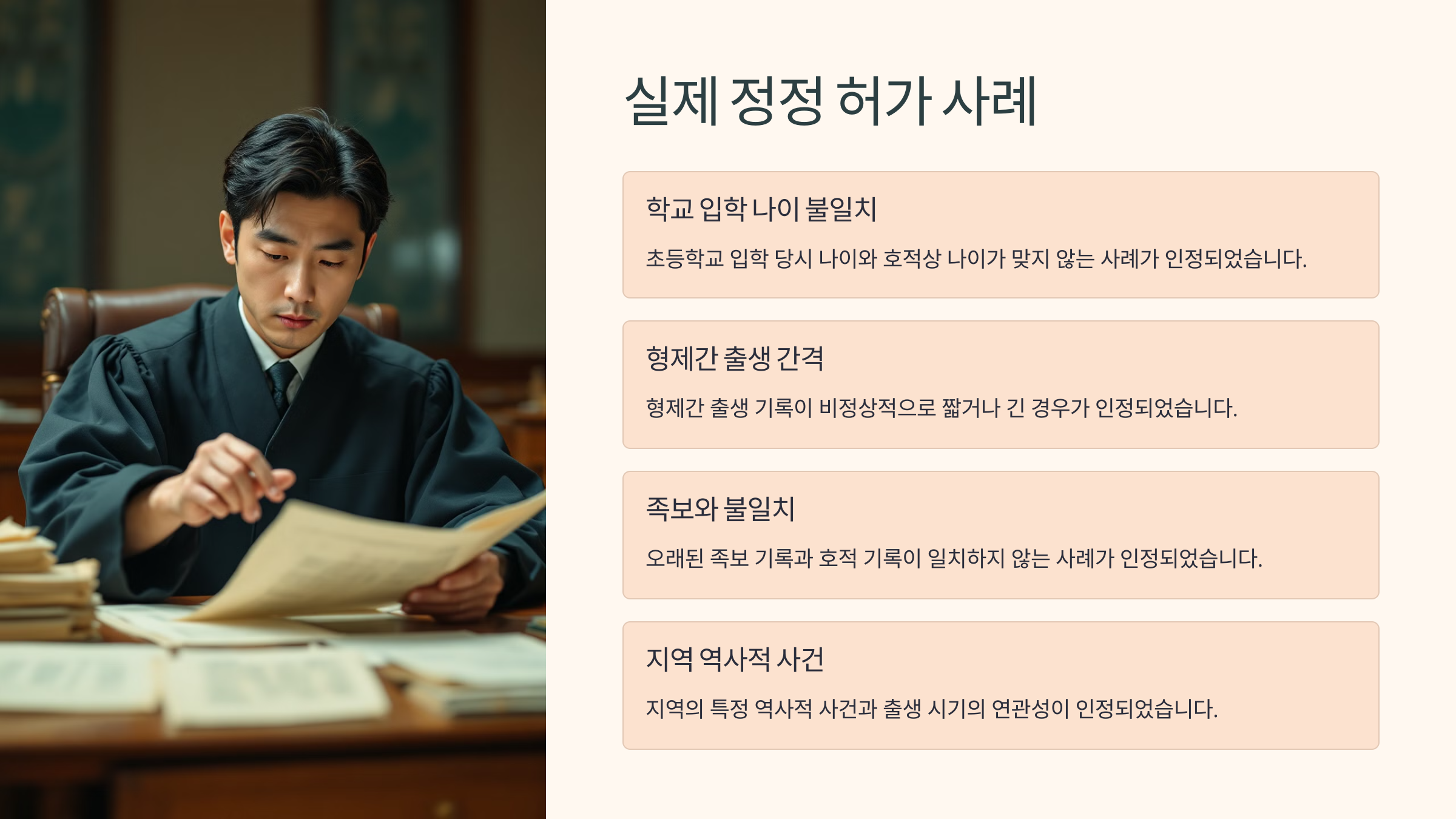 증거 유형 설명 신뢰도 출생 증명서 병원에서 발급한 공식 출생 기록 ⭐⭐⭐⭐⭐ 초등학교 졸업증명서 입학 연도를 통해 나이 확인 가능 ⭐⭐⭐⭐ 가족관계등록부 가족 간 연령 차이 분석 ⭐⭐⭐ 진술서 부모, 친척의 증언 ⭐⭐ 법원은 이처럼 다양한 증거를 종합적으로 검토해 신청을 승인하거나 기각해요. 따라서 가능하면 신뢰도 높은 증거를 여러 개 제출하는 것이 좋아요. 🧐
