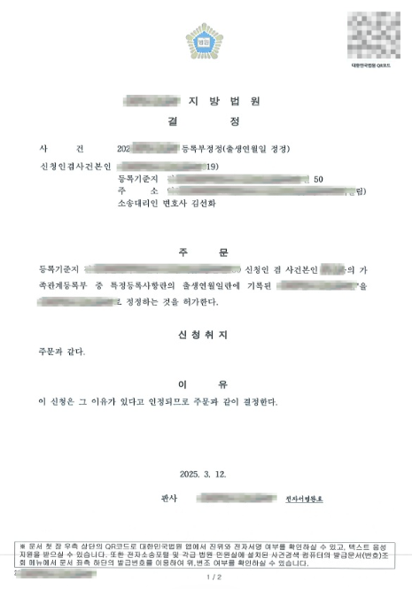 여러차례 법률 대리인의 적극적인 설명과 노력으로 이러한 증거를 종합적으로 고려한 법원은 결국 그의 나이 정정 신청을 2025. 3. 12일자로 아래와 같이 허가했어요.