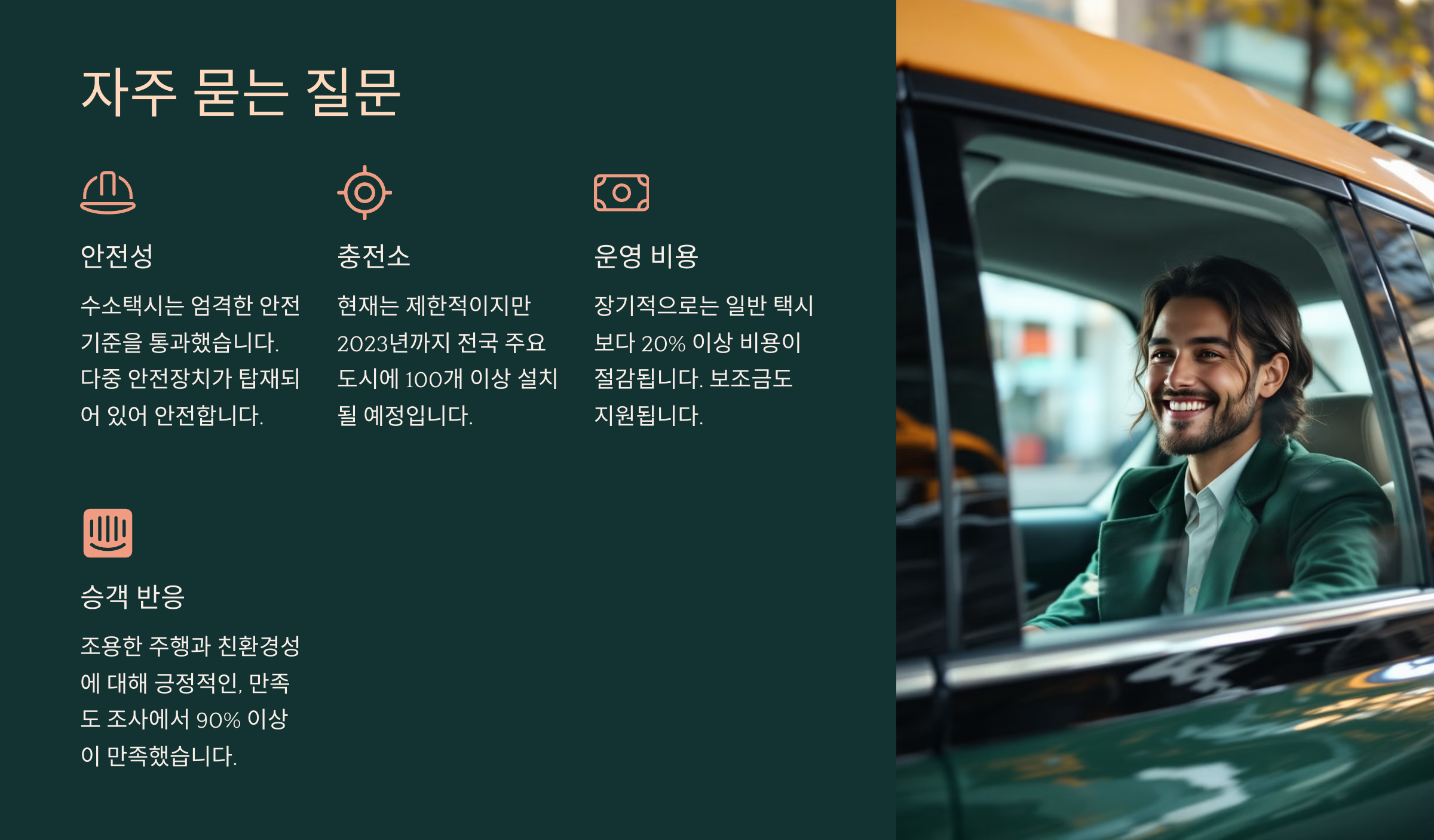 A3. 일반 내연기관 택시보다 유지보수 비용이 낮아요. 엔진 오일 교체가 필요 없고, 연료전지와 배터리 수명이 길어 장기적으로 보면 경제적이에요.