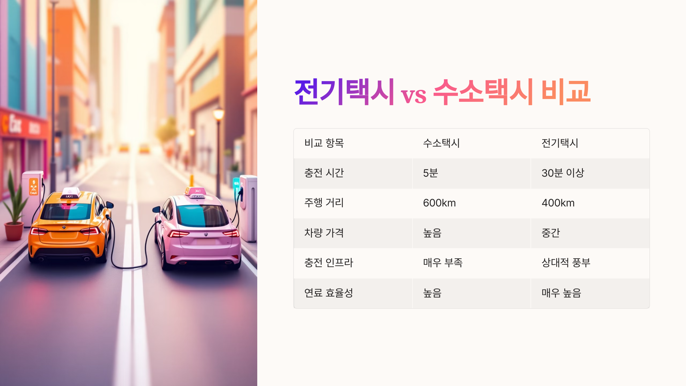 항목 전기택시 (EV) 수소택시 (FCEV) 충전 시간 30분~1시간 (급속 기준) 3~5분 주행 거리 300~500km 600km 이상 충전 인프라 전국적으로 확산 중 매우 부족함 유지 비용 전기 충전비 저렴 수소 연료비 부담 환경 영향 무공해 차량 물만 배출 전기택시는 저렴한 충전 비용과 넓은 충전 인프라가 강점인 반면, 수소택시는 빠른 충전과 긴 주행거리에서 우위를 차지해요. 현재는 전기택시가 보급 속도가 빠르지만, 수소 충전소가 늘어나면 수소택시의 경쟁력도 높아질 것으로 기대돼요! 🚀