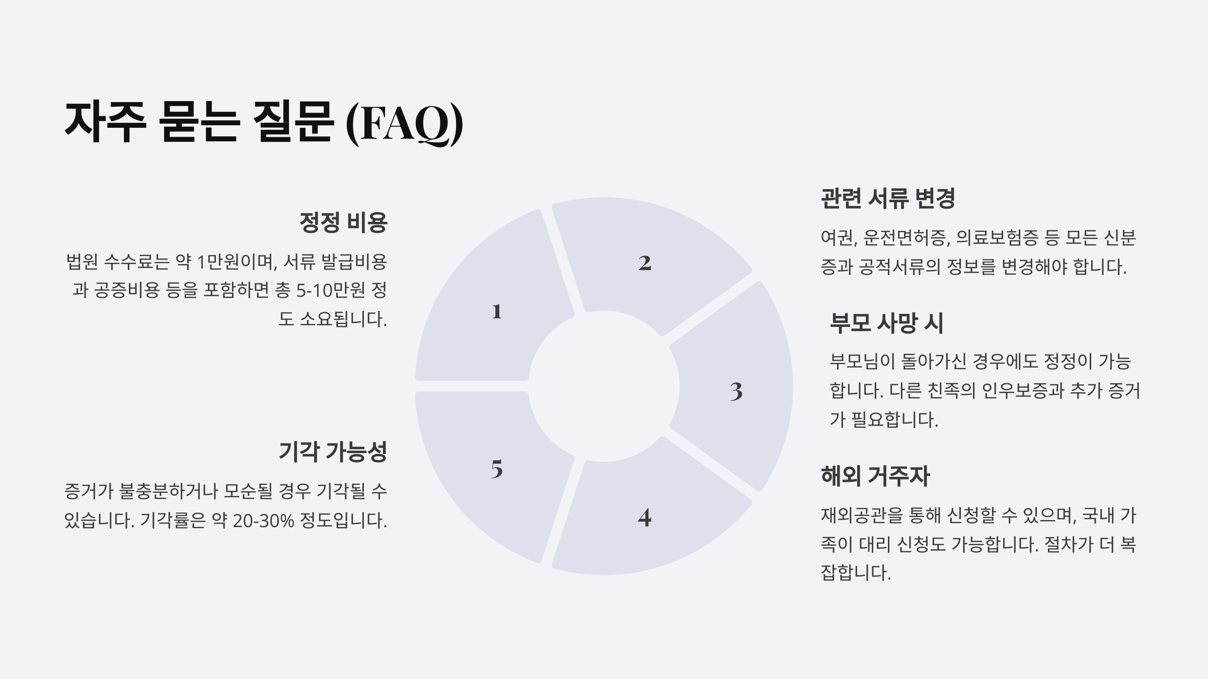 정정 대상 신청 절차 소요 기간 주민등록부 정정 주민센터 방문 → 신청서 작성 및 제출 → 담당 공무원 확인 후 정정 1~2주 가족관계등록부 정정 법원에 정정 신청 → 서류 심사 → 심문기일 지정(필요 시) → 법원 결정 → 변경 완료 1~3개월 이처럼 주민등록부 정정은 행정 절차만으로 가능하지만, 가족관계등록부 정정은 법원의 판단이 필요하기 때문에 더 오랜 시간이 걸려요.