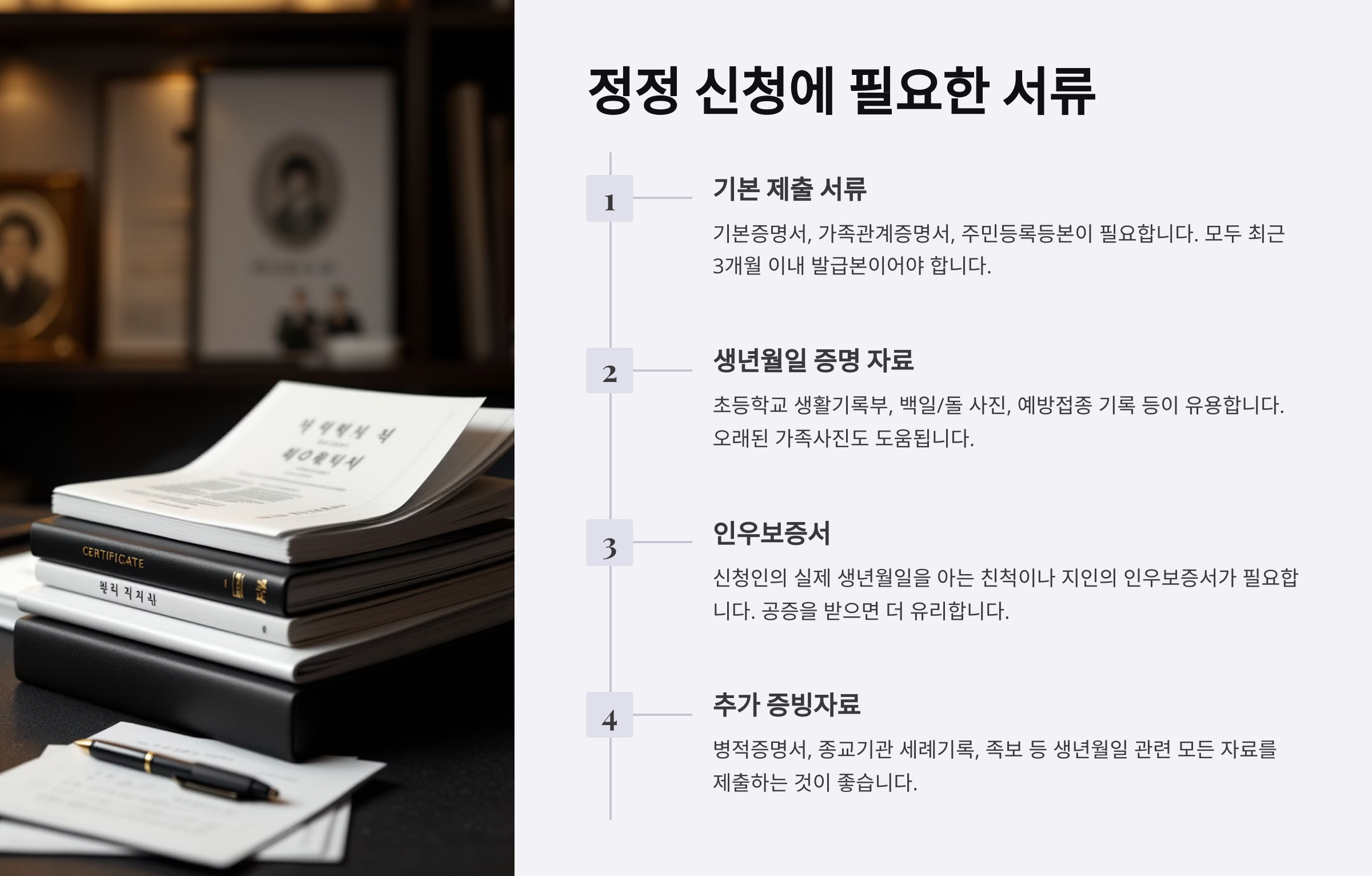 📌 증빙 서류 준비 출생증명서, 학적부, 병원 기록 등 객관적인 자료가 있어야 법원이 정정을 승인해요.