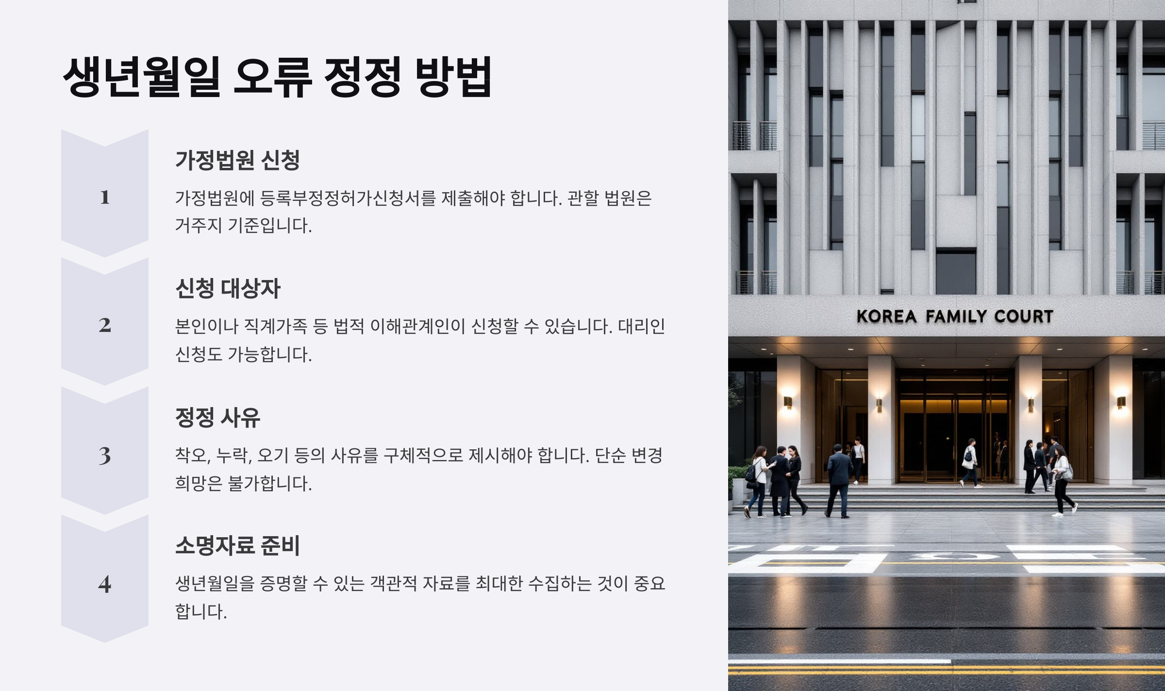 📌 증빙 서류 준비 출생증명서, 학적부, 병원 기록 등 객관적인 자료가 있어야 법원이 정정을 승인해요.