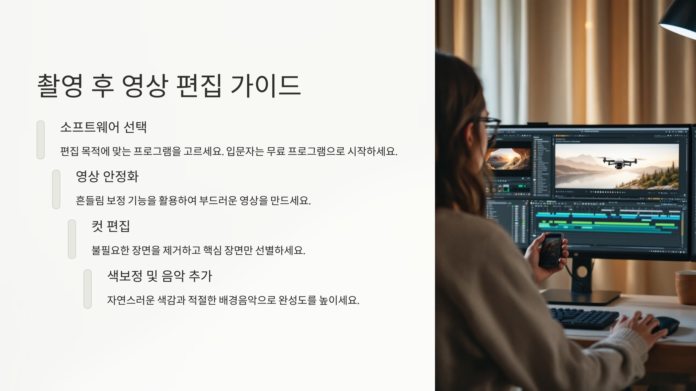 드론으로 멋지게 촬영한 영상은 편집을 통해 더욱 생동감 있게 완성할 수 있어요. 단순히 찍는 것만으로 끝나는 게 아니라, 색보정, 전환 효과, 배경음악을 활용하면 같은 장면도 훨씬 더 드라마틱하게 만들 수 있답니다.처음 영상 편집을 시작할 때는 어렵게 느껴질 수 있지만, 기본적인 컷 편집과 전환만 익혀도 충분히 감성적인 영상이 완성돼요. 특히 드론 영상은 ‘풍경 중심’이라 자막이나 과한 효과 없이도 감탄을 자아내는 장면을 만들 수 있죠.