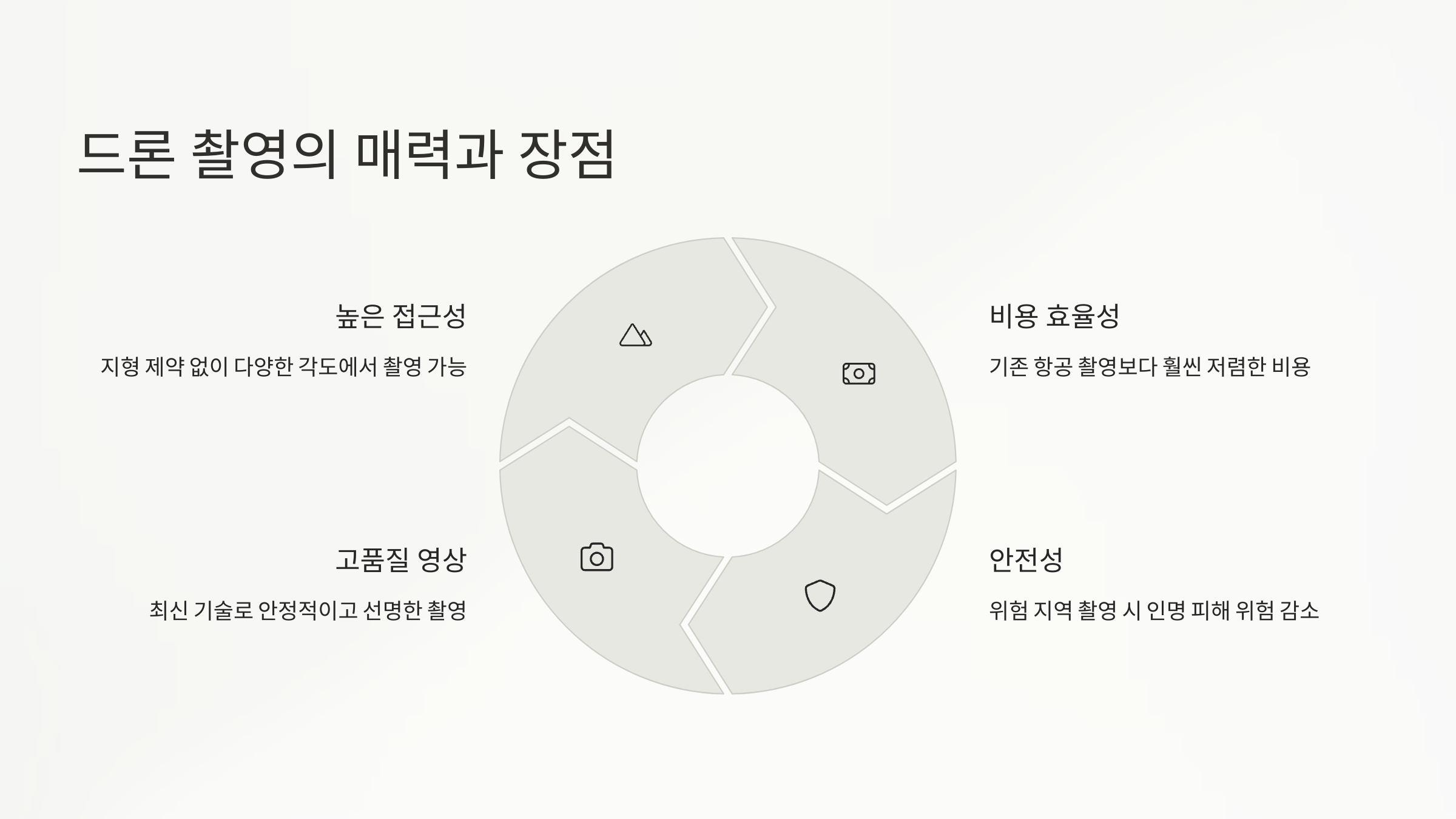 드론 촬영의 가장 큰 매력 드론 촬영의 가장 큰 매력은 ‘새로운 시점’에서 세상을 바라볼 수 있다는 거예요. 땅에서는 볼 수 없는 풍경을 하늘 위에서 담을 수 있기 때문에, 장엄한 자연 경관이나 도시의 대칭적인 건축물도 전혀 다른 느낌으로 다가와요.