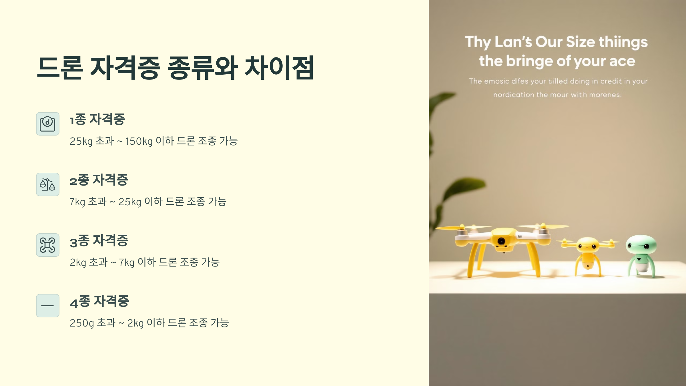 드론 자격증은 크게 1종, 2종, 3종으로 나뉘어요. 종류에 따라 운용 가능한 드론의 무게와 환경이 다르기 때문에, 어떤 자격증이 본인에게 맞는지를 먼저 판단하는 게 중요해요.1종은 무게가 25kg 이상인 드론을 조종할 수 있으며, 대부분 산업용, 군사용, 방제용 등에 사용돼요. 반면 2종은 7kg~25kg 이하, 3종은 2kg~7kg 이하 드론까지 다룰 수 있어요. 촬영용으로 가장 많이 사용하는 모델은 3종에 해당하므로 입문자는 보통 3종을 먼저 취득한답니다.