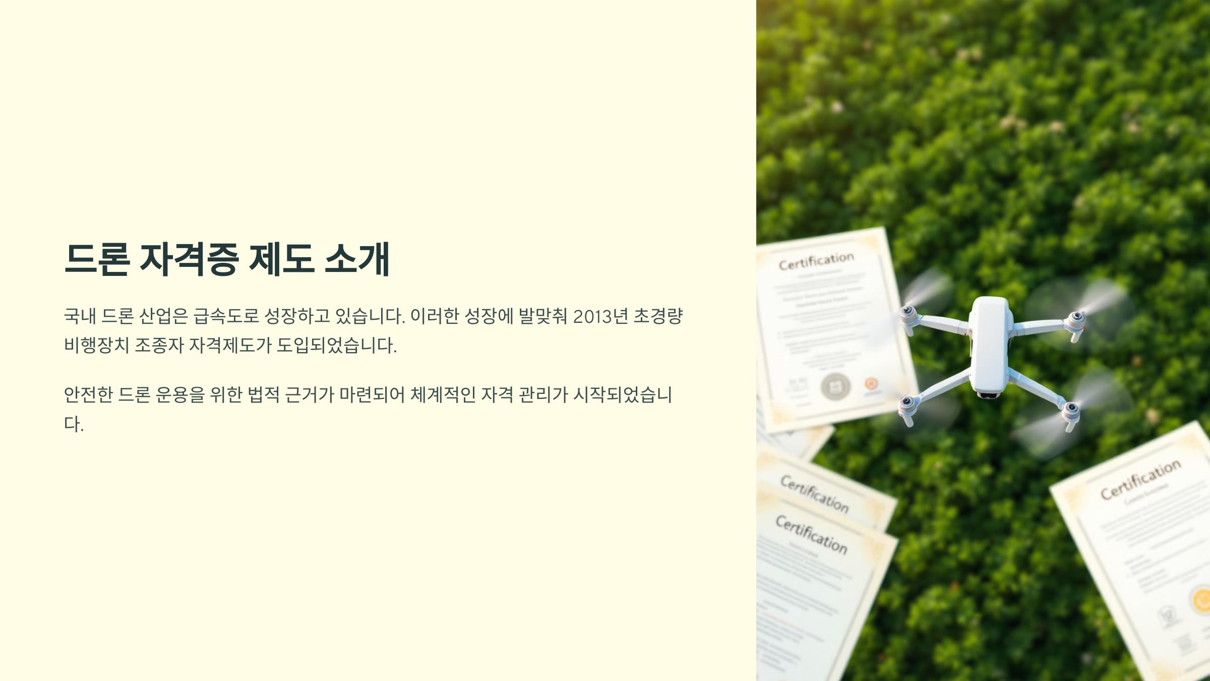 자격증 제도는 드론을 운용하는 사람들의 안전 지식과 비행 기술을 높이기 위한 목적이에요. 이를 통해 비행 허가, 장비 등록, 항공 촬영 허가 등을 보다 체계적으로 관리할 수 있게 되었어요. 현재는 드론 자격증이 없으면 250g 이상 드론은 합법적으로 조종하기 어렵게 되었죠.