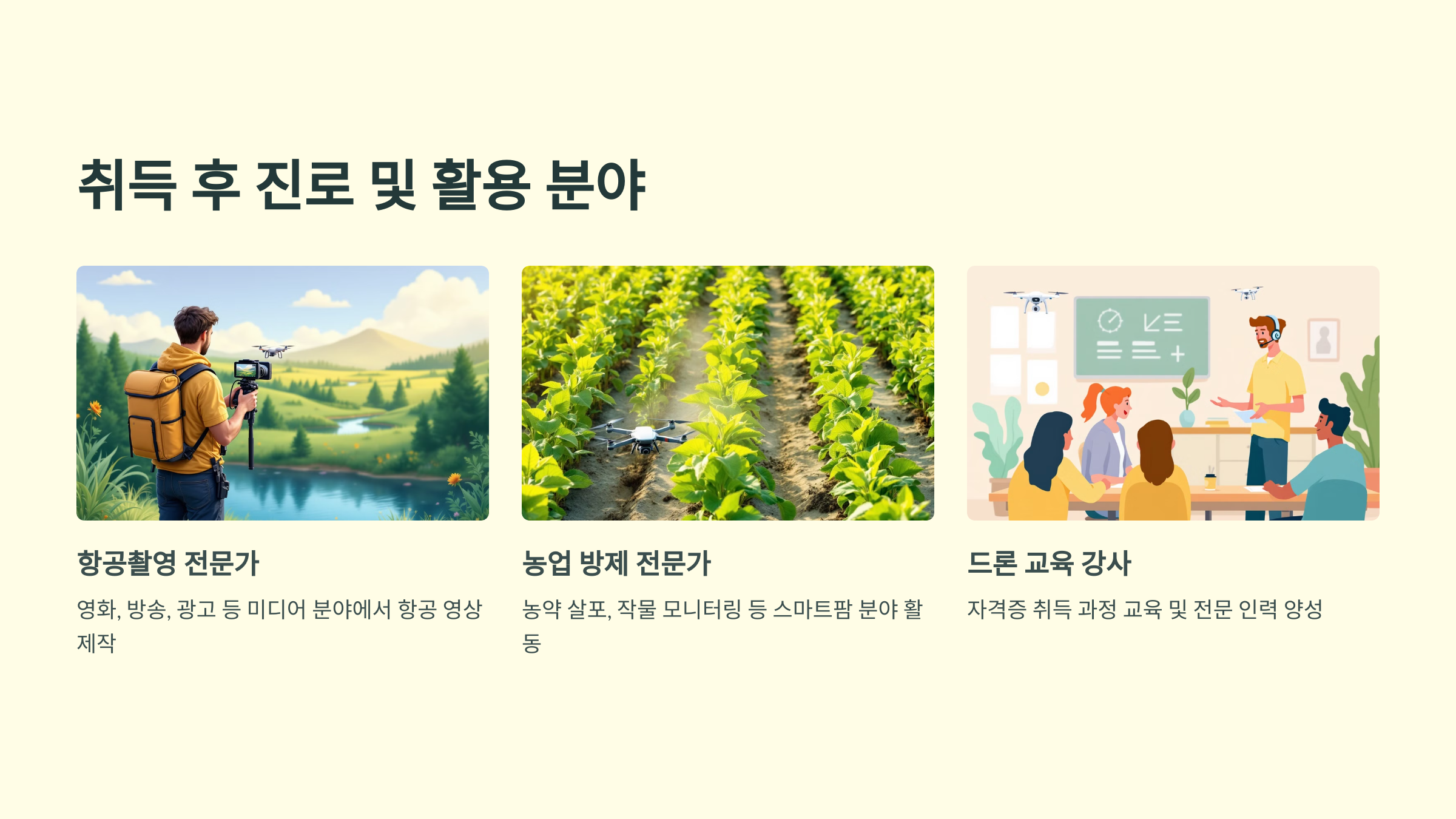 취득 후 진로 및 활용 분야 드론 자격증을 취득하면 활용 분야가 정말 다양해요. 영상 촬영, 방송 제작, 광고 영상, 행사 기록 등 콘텐츠 산업은 물론이고, 농약 살포, 구조 활동, 시설 점검, 태양광 패널 검측까지 다양한 산업에서 인재를 찾고 있어요.