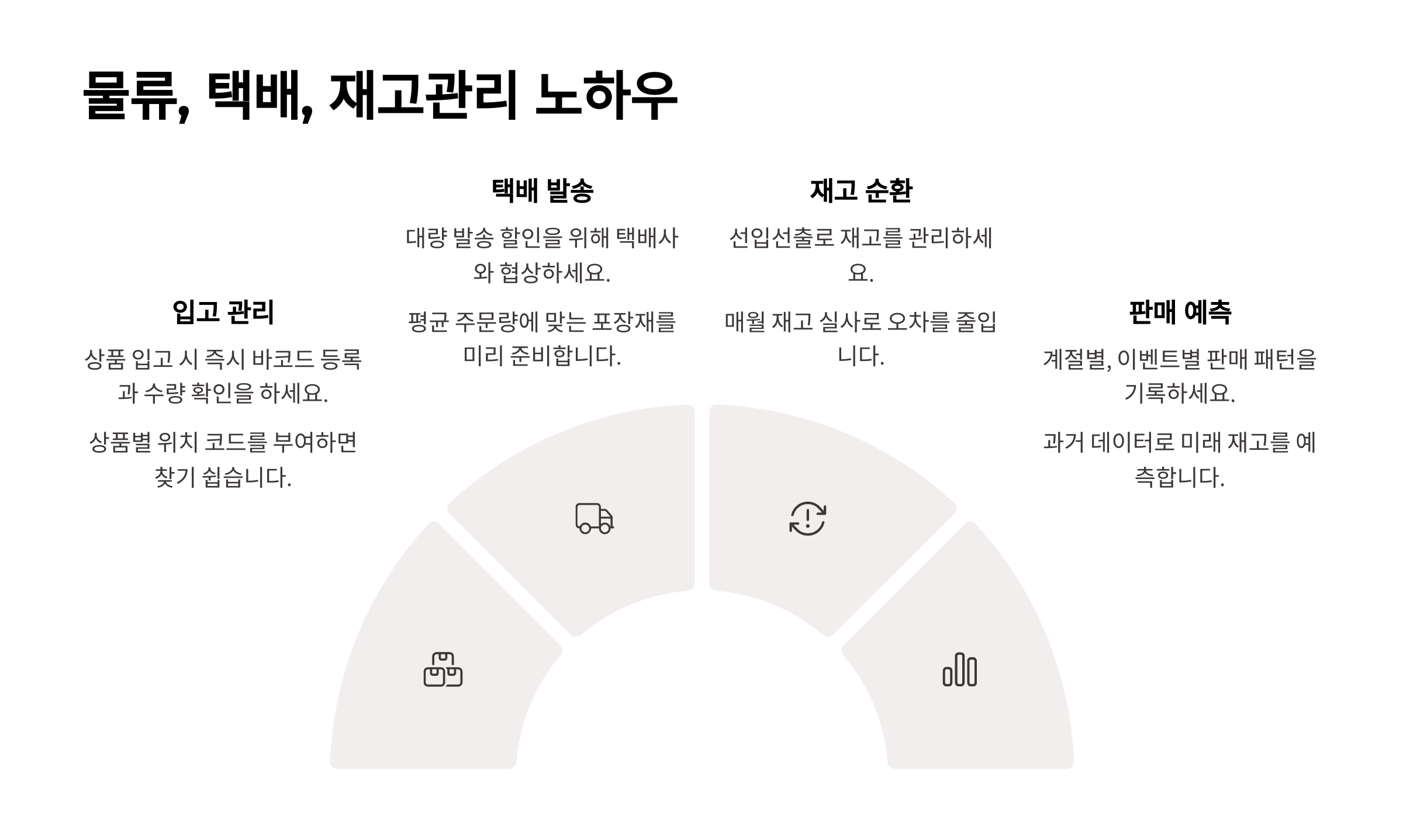물류, 택배, 재고관리 노하우 판매가 시작되면 물류와 택배가 핵심 이슈가 돼요. 특히 혼자 운영하는 소형 쇼핑몰은 시간과 체력을 아끼기 위해 물류 관리를 잘해야 해요. 스마트스토어나 자사몰이든 물류 전략은 필수예요.