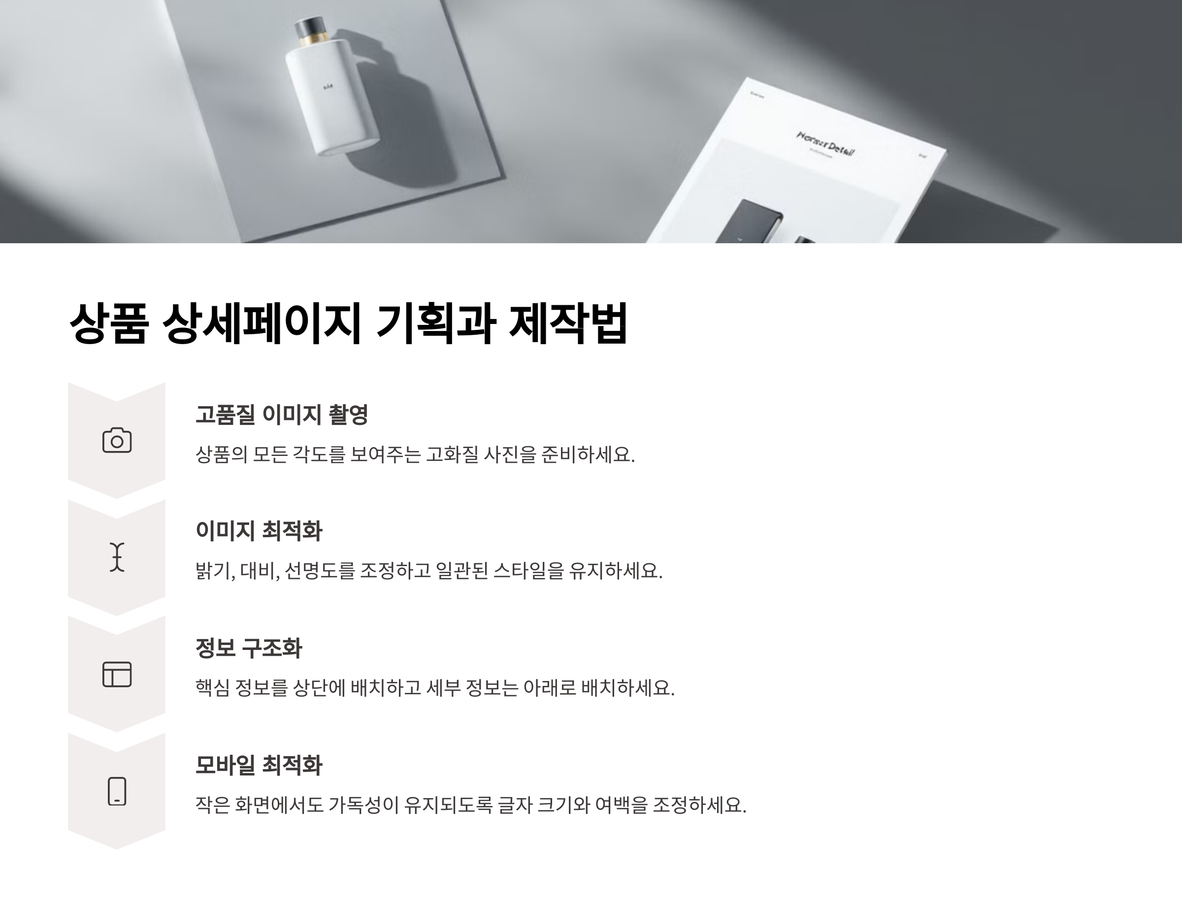 기본 구성은 이렇습니다: 썸네일 → 제품 강점 → 사용 방법 → 사이즈/소재 → 구성품 → 리뷰/후기 → 배송/반품 정책. 이 흐름대로 구성하면 소비자가 자연스럽게 읽고 결제까지 이어지기 쉬워요.