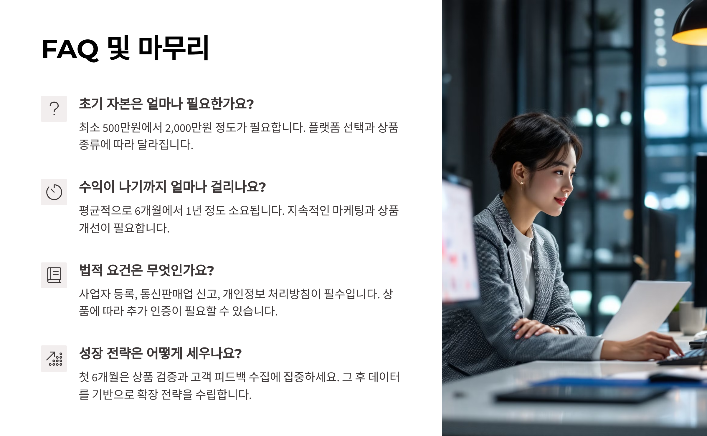 A1. 초기에는 약 10~50만 원 정도로 시작 가능해요. 사업자 등록, 도메인, 기본 광고비, 샘플 구매 비용이 포함돼요. 자사몰 구축 시엔 더 들 수 있어요.