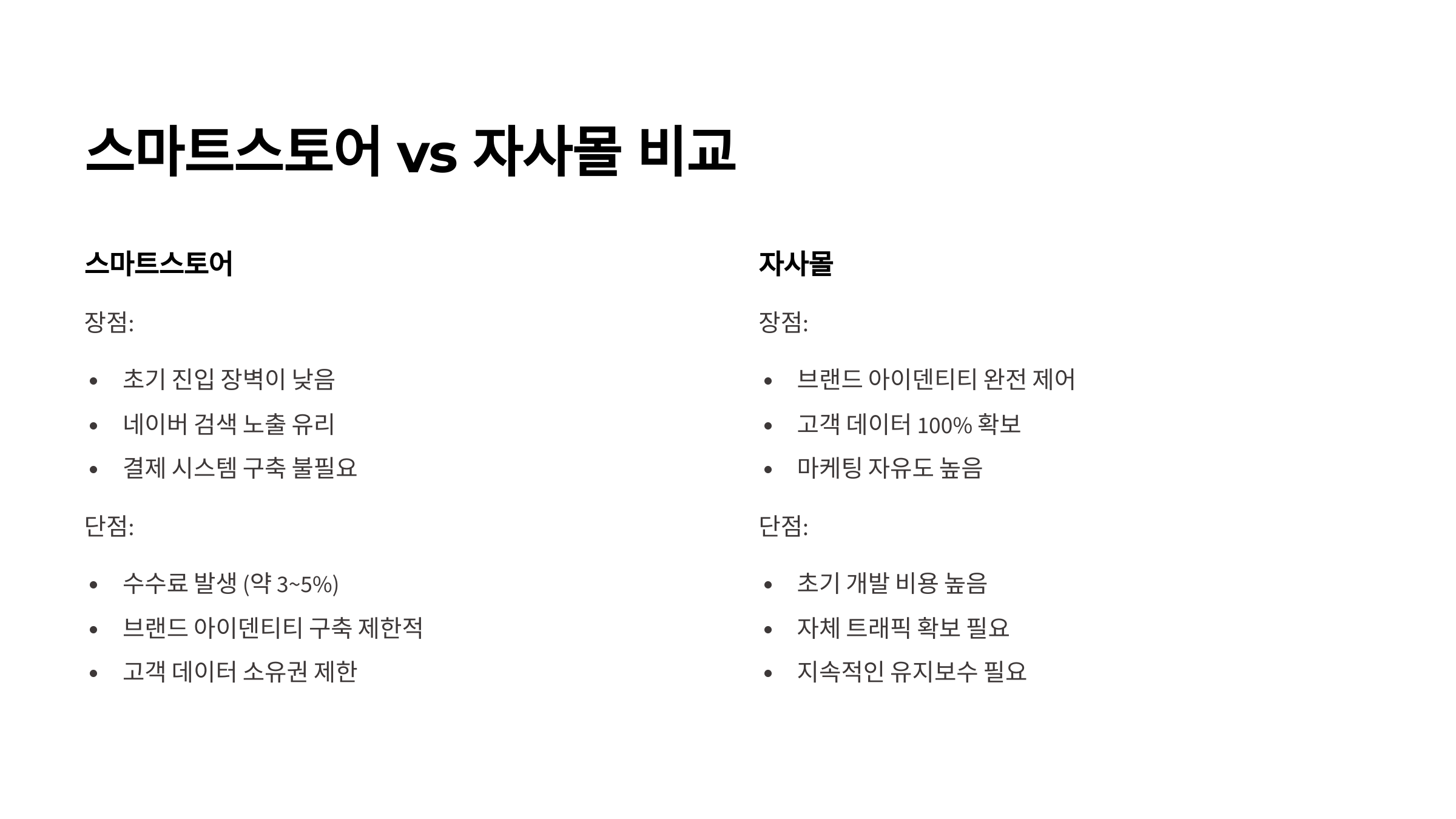 스마트스토어 vs 자사몰 비교 쇼핑몰 창업할 때 가장 많이 고민하는 게 "스마트스토어로 할까? 자사몰로 할까?"예요. 둘 다 장단점이 명확하니까 내가 원하는 운영 방식에 따라 선택해야 해요.