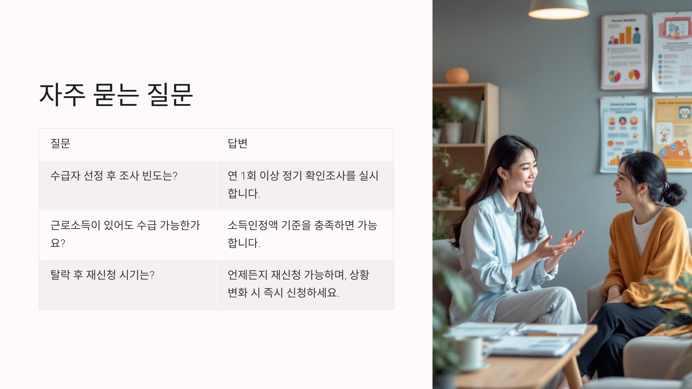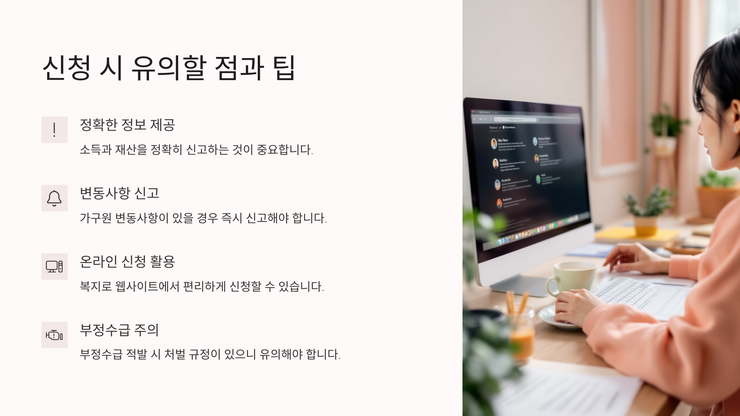 마지막 팁은, 수급자 선정 후에도 ‘변동신고’를 잘 해야 해요. 소득이 늘었거나 가족 구성원이 바뀌면 즉시 신고해야 과지급이나 환수 문제가 생기지 않아요. 이건 꼭 지켜야 해요!