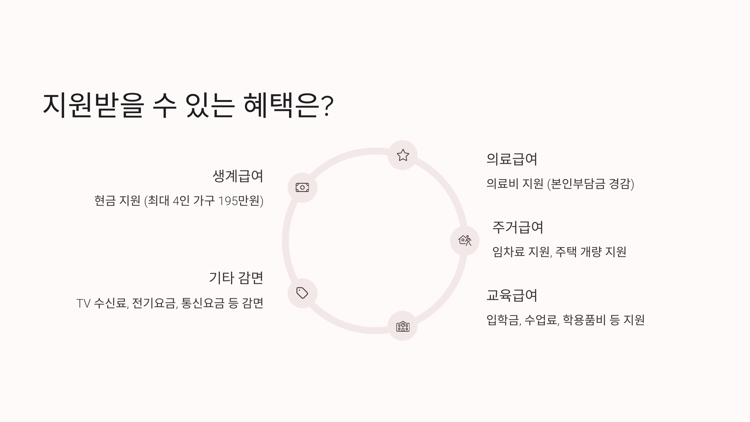 지원받을 수 있는 혜택은? 기초생활수급자로 선정되면 크게 네 가지 분야에서 혜택을 받을 수 있어요. 생계, 의료, 주거, 교육이에요. 이 외에도 추가로 긴급복지, 감면 혜택 등도 있으니 꼭 확인해보세요.