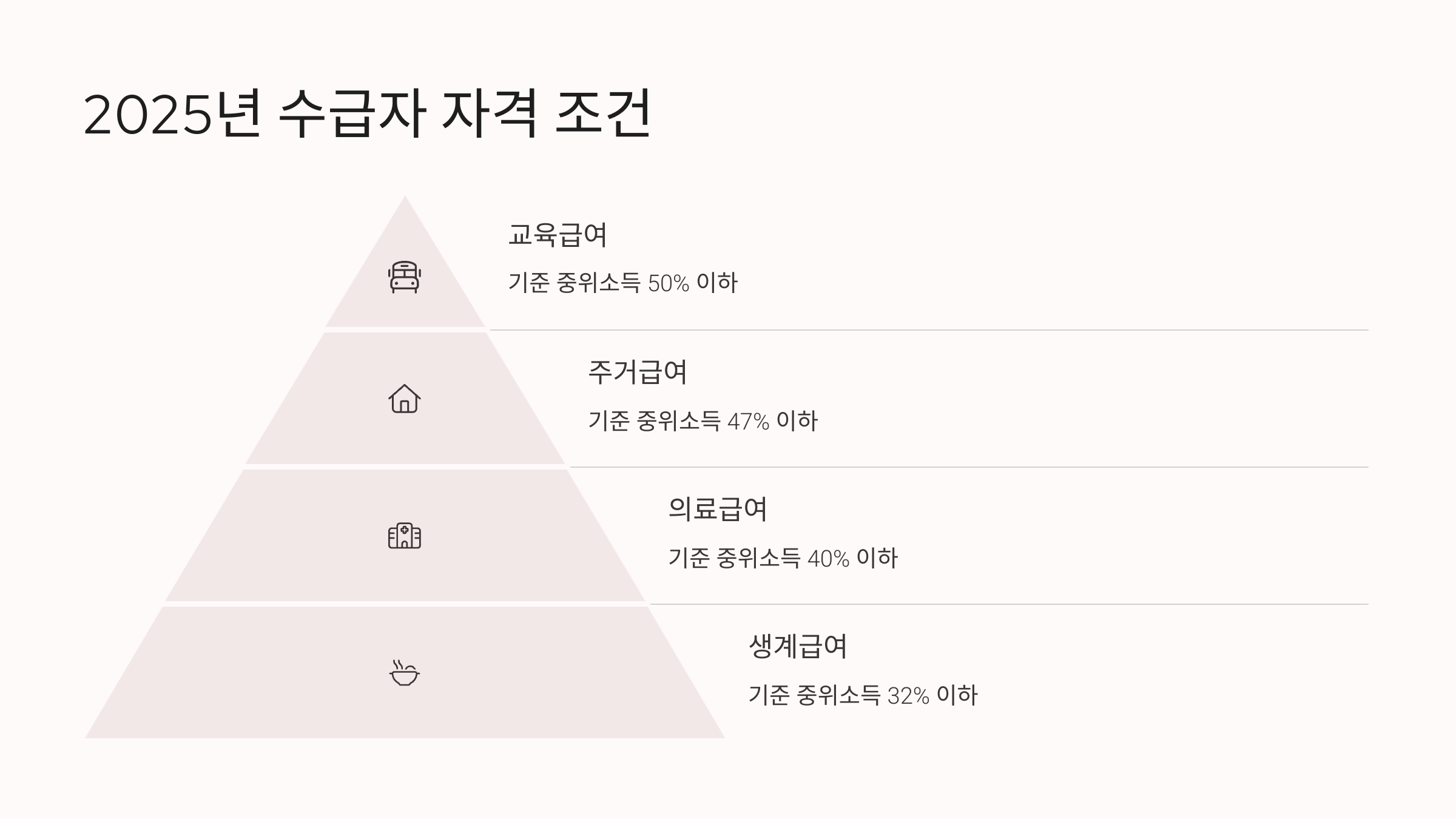 2025년 수급자 자격 조건 2025년 기준 기초생활수급자가 되기 위해서는 ‘소득인정액’이 기준 중위소득 대비 일정 비율 이하이어야 해요. 이 소득인정액은 실제 소득 + 재산을 소득으로 환산한 금액이에요. 예를 들어, 자동차나 예금도 일부 소득으로 간주된답니다.