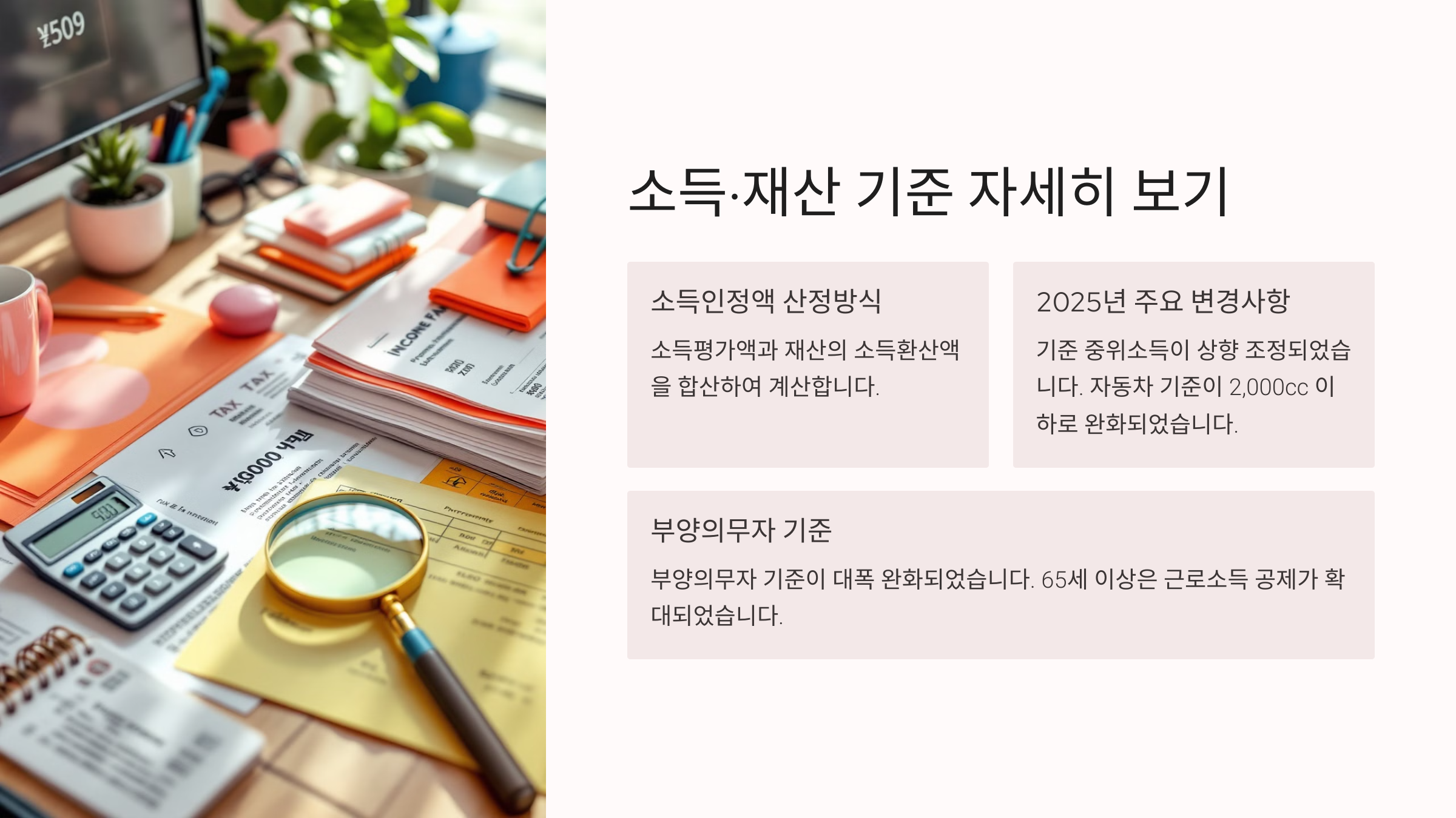 재산 기준도 따로 있어요. 일반재산과 금융재산, 자동차 등이 포함되는데 지역마다 '재산의 환산율'이 달라요. 서울과 지방의 부동산 가치 차이를 반영한 거죠. 이 부분은 담당 공무원이 잘 설명해줄 거예요!