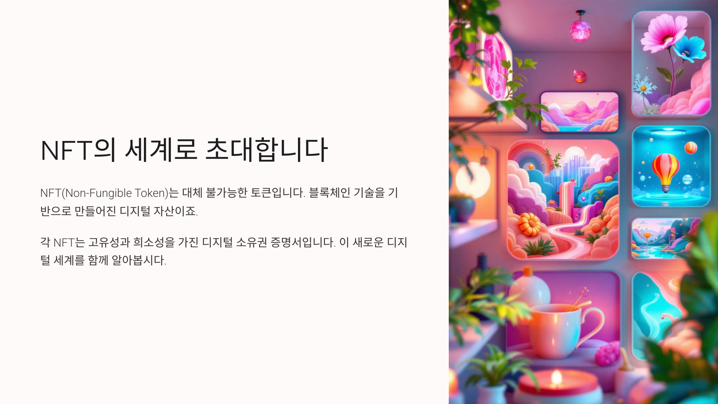 NFT는 "Non-Fungible Token"의 줄임말로, 우리말로는 '대체 불가능 토큰'이라고 해요. 쉽게 말하면 하나하나 고유한 값을 가진 디지털 자산이에요. 비트코인이나 이더리움 같은 코인은 모두 동일한 가치를 가지지만, NFT는 각각의 토큰이 다른 가치를 지니고 있어서 서로 교환이 불가능하답니다.