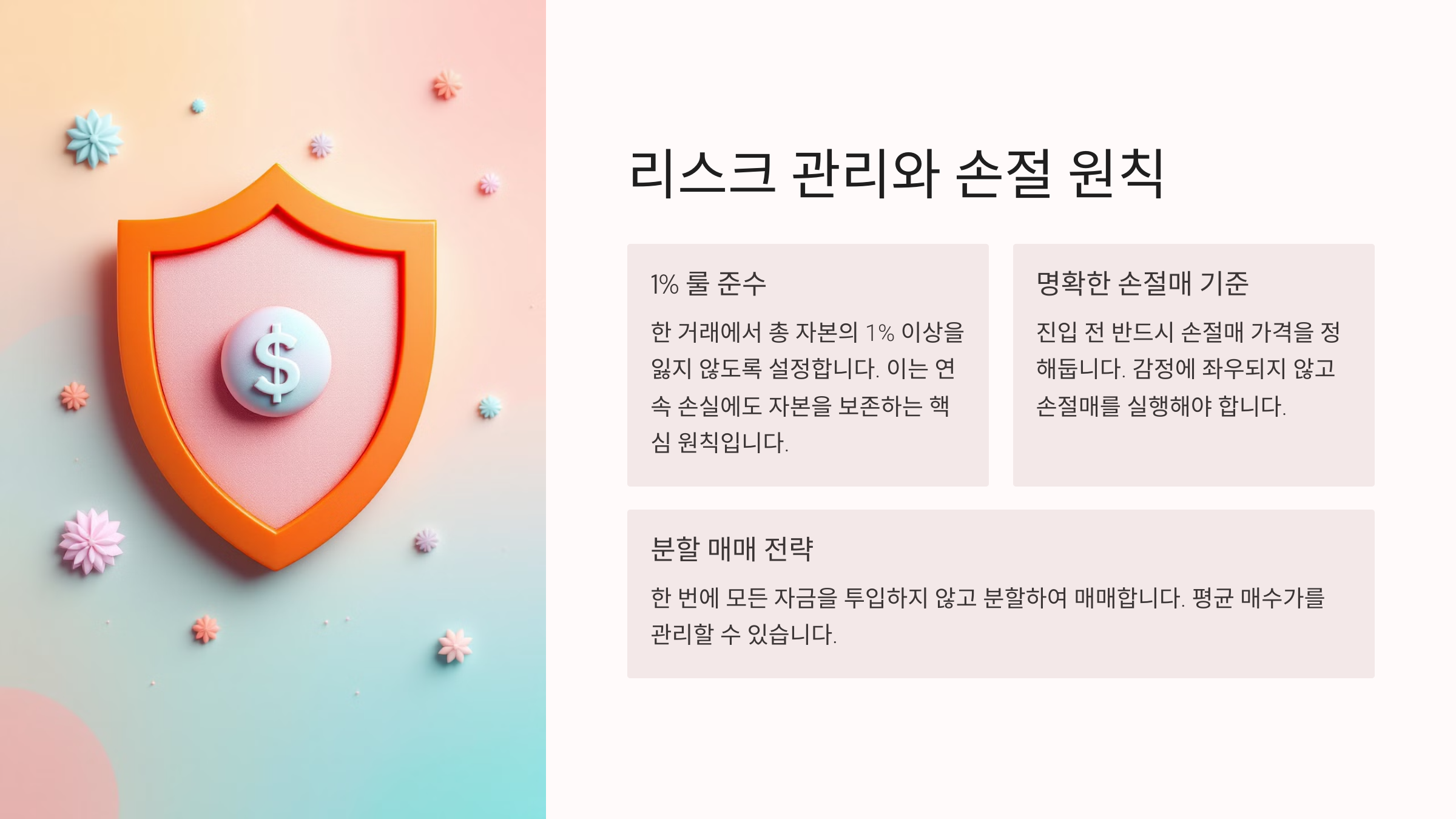 리스크 관리와 손절 원칙 단타 매매에서 가장 중요한 원칙 중 하나는 바로 ‘손절’이에요. 아무리 분석이 완벽해도 주가는 예상과 다르게 움직일 수 있어요. 그럴 때 손해를 줄이기 위해 ‘손절 기준’을 명확히 해두지 않으면, 소액 손실이 대형 손실로 번지는 경우가 많아요. 리스크 관리는 단타의 생명줄과도 같답니다. 🛟