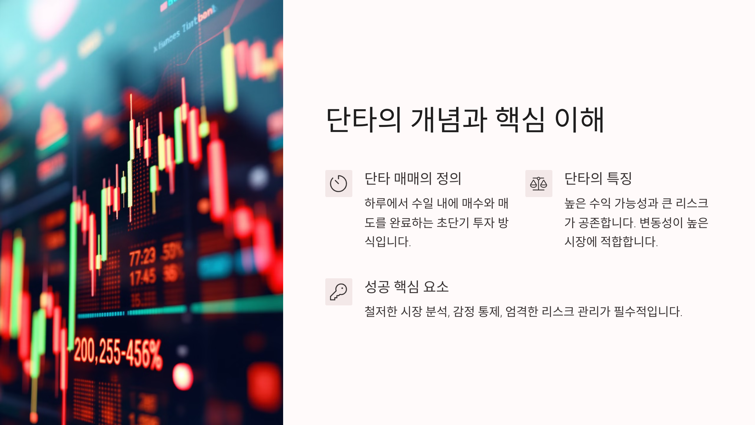 📈 단타 매매는 주식을 짧은 시간 동안 보유하고 차익을 실현하는 거래 방식이에요. 보통 하루 안에 사고파는 '데이 트레이딩'부터, 수 분 내에 매매가 이루어지는 '스캘핑'까지 다양한 스타일이 있어요. 짧은 시간에 수익을 낼 수 있다는 장점 때문에 많은 사람들이 관심을 가지지만, 그만큼 리스크도 크답니다.
