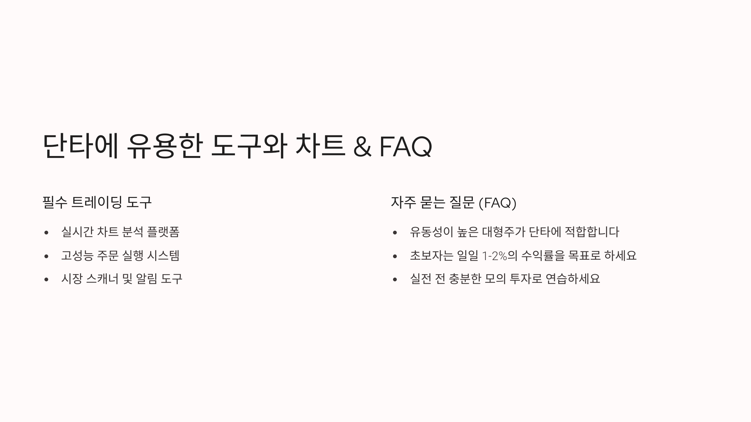 도구 용도 추천 플랫폼 활용 팁 HTS/MTS 실시간 매매와 정보 확인 키움, 크레온, 삼성 즐겨찾기 세팅 필수 보조지표 매수/매도 타이밍 판단 RSI, MACD, MA 2개 이하만 사용 권장 뉴스 알림 속보 기반 단타 대응 네이버, 팍스넷, 인포스탁 관심 키워드 알림 설정 매매일지 복기 및 성장 기록 엑셀, 구글 시트 매수 이유 구체화 단타는 감으로 하는 매매가 아니에요. 도구와 분석을 통해 ‘확률’을 높이는 게임이에요. 실전에서 쓸 수 있는 도구들을 익히고, 꾸준히 사용하다 보면 확실히 다른 결과가 나와요. 📈 다음은 가장 많이 묻는 궁금증들을 FAQ로 정리해봤어요! 👇