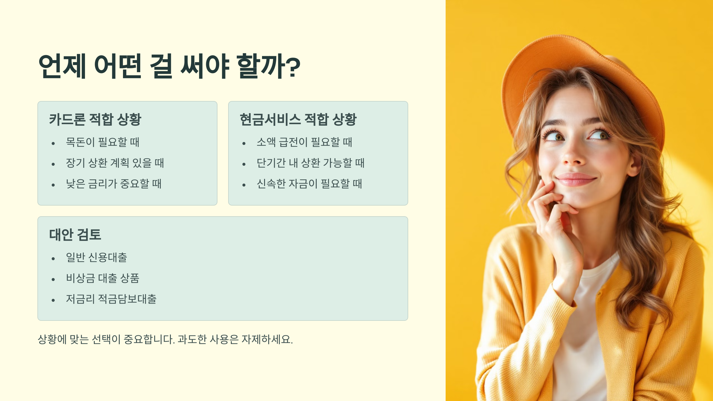 예를 들어, 결혼식 준비나 큰 병원비처럼 금액이 크고 시간을 두고 갚아야 할 상황이라면 카드론이 좋아요. 반면, 며칠 뒤 월급이 들어오는데 당장 현금이 필요하다면 현금서비스가 더 간편하죠.