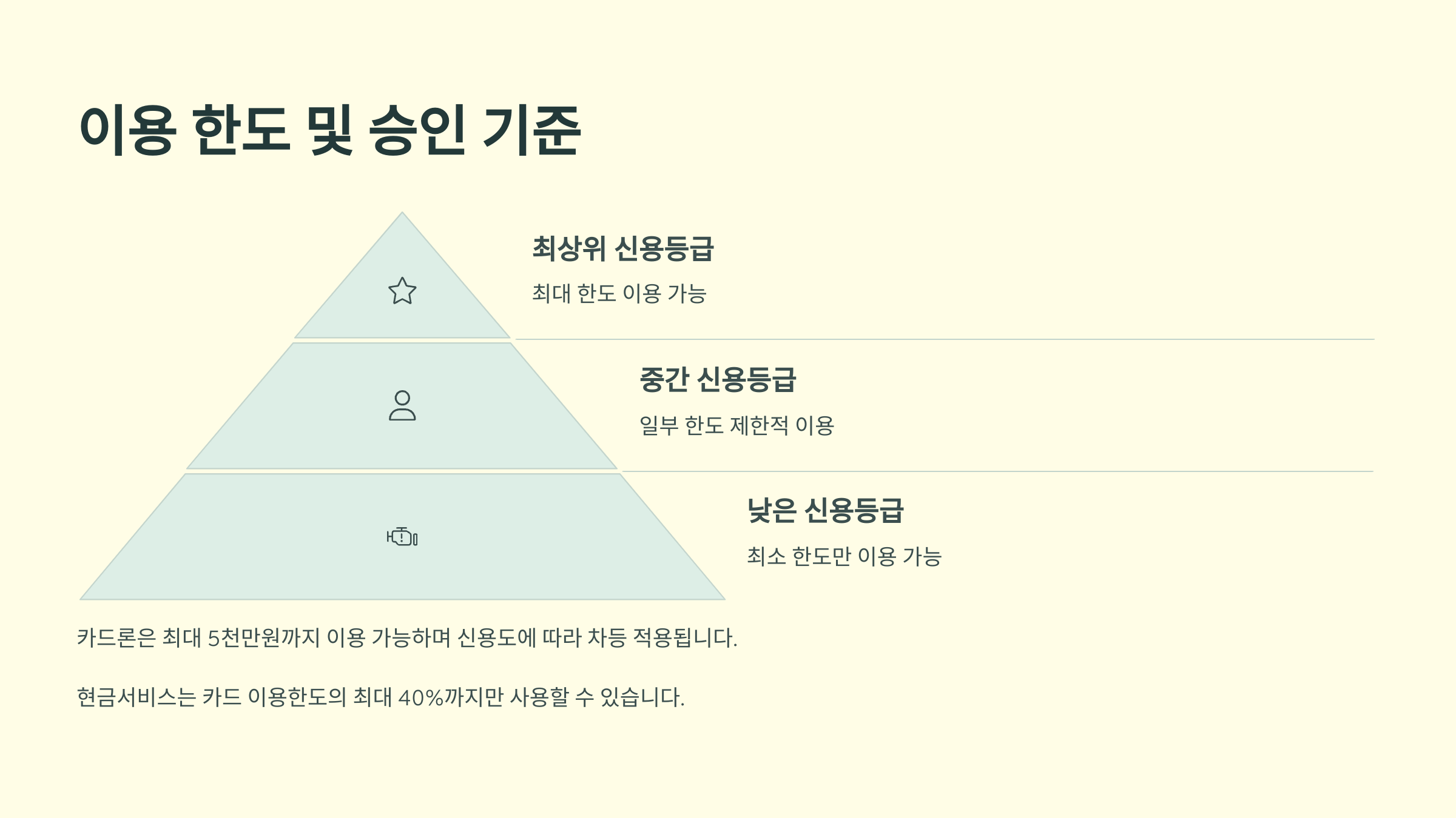 카드론과 현금서비스 모두 신용카드를 가진 사람이라면 누구나 이용 가능하지만, ‘얼마까지 빌릴 수 있냐’와 ‘어떤 조건으로 승인되느냐’는 꽤 달라요. 이 부분도 정말 중요한 포인트예요!