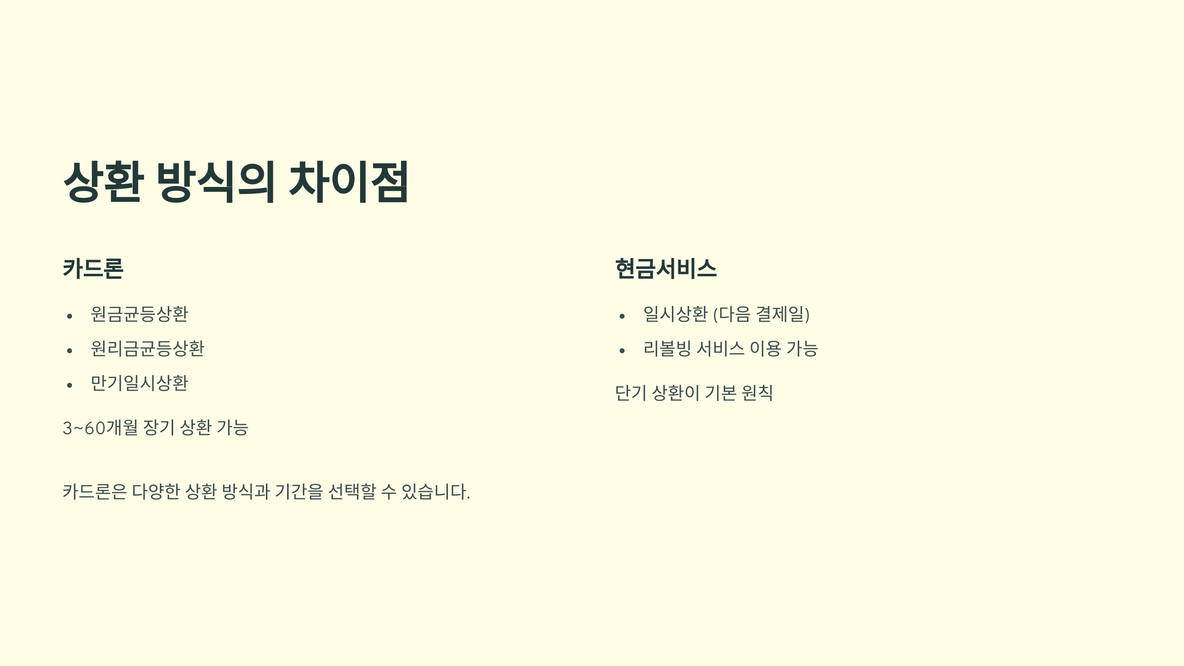 먼저 카드론은 장기 상환이 가능하다는 점이 가장 큰 장점이에요. 보통 3개월, 6개월, 12개월, 36개월까지 기간을 설정할 수 있고, '원리금 균등 상환'이나 '만기 일시 상환'을 선택할 수 있어요. 매달 일정 금액을 갚아 나가는 구조라 부담이 덜하죠.