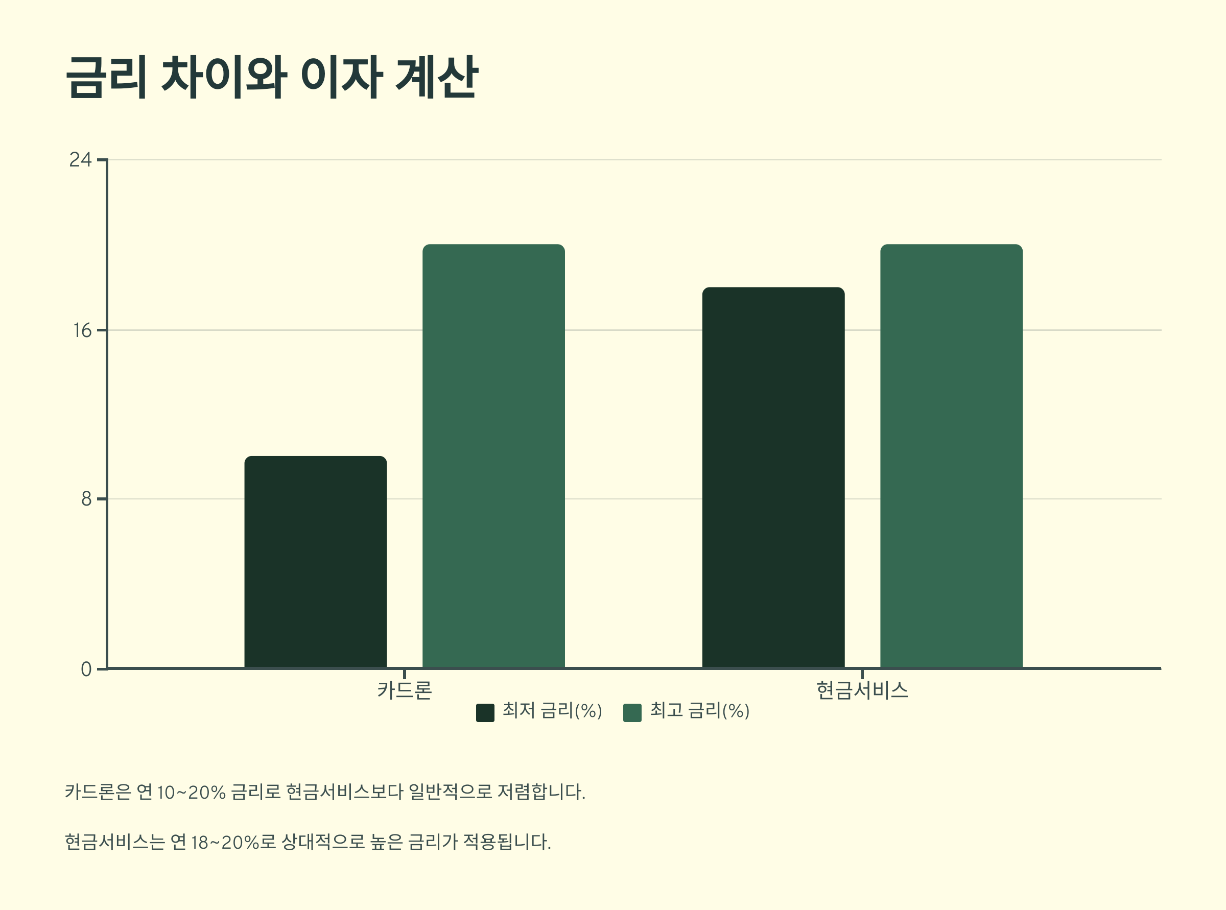 예를 들어, 100만 원을 카드론으로 연 7% 금리에 6개월 동안 빌렸다면 약 2만 원 정도의 이자를 내지만, 현금서비스로 1개월간 빌리면 이자만 1만 원이 넘을 수 있어요. 기간이 짧아도 부담이 크죠.