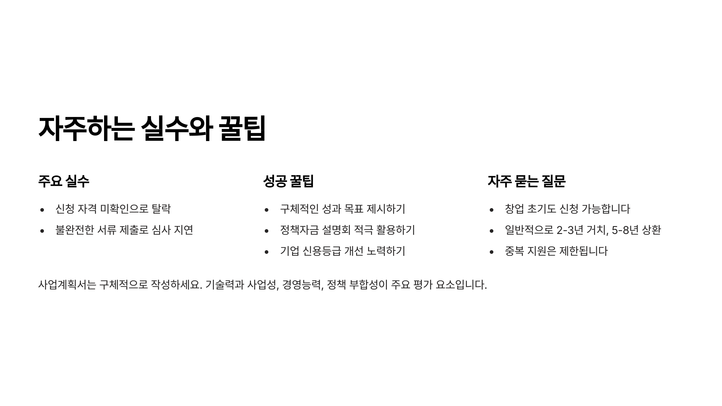 항목 내용 서류 준비 필수 서류 외 추가 서류 확인 계획서 작성 비전·전략 강조, 단순 수치 피하기 온라인 사전진단 공단 홈페이지에서 활용 가능 지역별 전략 지역 경쟁률 고려한 신청 보완요청 대응 문자/메일 수시 확인 이제 정말 많이 준비됐죠? 마지막으로 사람들이 가장 많이 물어보는 질문들을 모아서 FAQ로 정리해봤어요. 꼭 확인해보세요! 👍