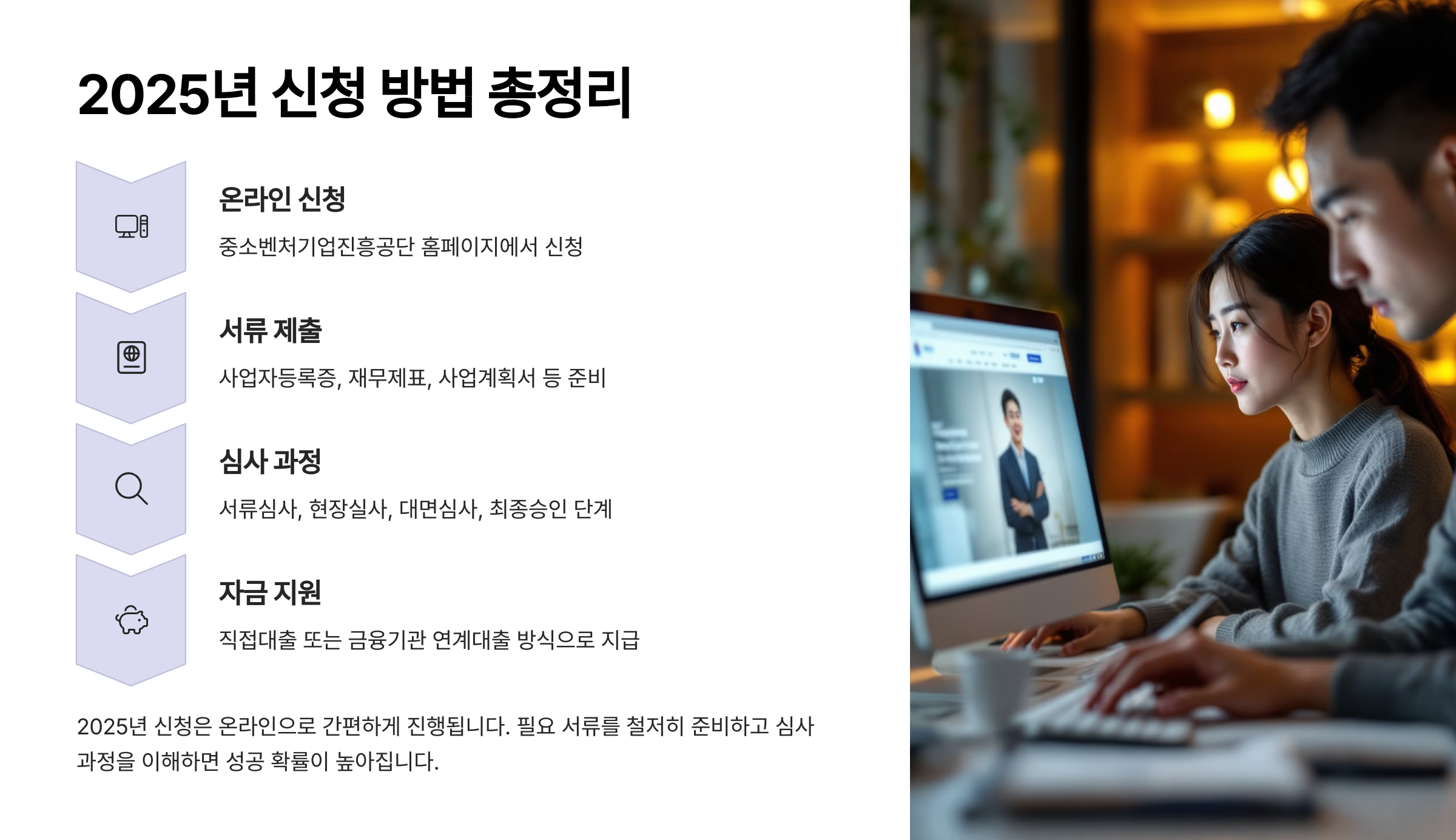 자금 신청은 크게 세 단계를 거쳐요. 첫 번째는 ‘회원가입 및 사업자 인증’, 두 번째는 ‘자금 종류 선택 및 기본정보 입력’, 마지막으로 ‘필수 서류 업로드 및 신청 완료’예요. 신청 후에는 소상공인시장진흥공단의 심사를 거쳐 대출 여부가 결정되는데, 심사 기간은 보통 2~3주 정도 소요돼요.