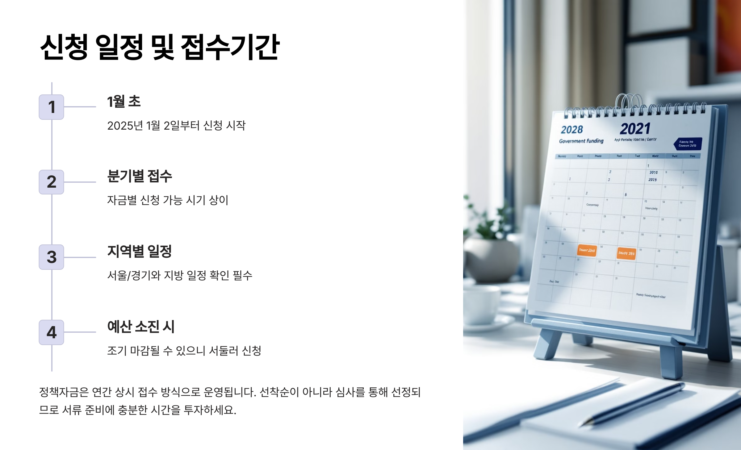 신청 일정 및 접수기간 2025년 소상공인 정책자금 신청은 자금 종류에 따라 시기별로 나눠져 있어요. 일반적으로는 1월부터 연중 수시 접수가 가능하지만, 일부 자금은 예산 소진 시 조기 마감될 수 있기 때문에 서두르는 게 좋아요. 특히 경영안정자금과 재도전자금은 인기가 많아서 빠르게 마감되는 편이에요.