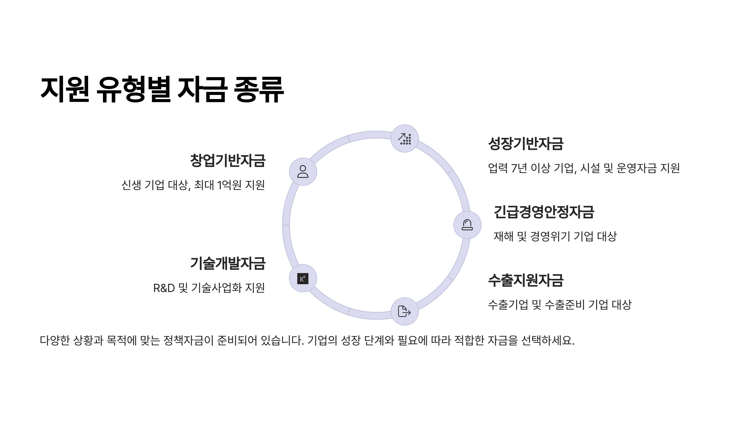 예를 들어, 창업 초기 자금이 부족한 1~3년 차 사업자에게는 ‘창업초기자금’이 있고, 운영이 어려운 분들에게는 ‘경영안정자금’이 제공돼요. 기술이 우수한 경우에는 ‘성장촉진자금’을 활용할 수 있고요. 이런 식으로 사업 단계에 맞춰 자금을 선택할 수 있다는 게 가장 큰 매력이에요.