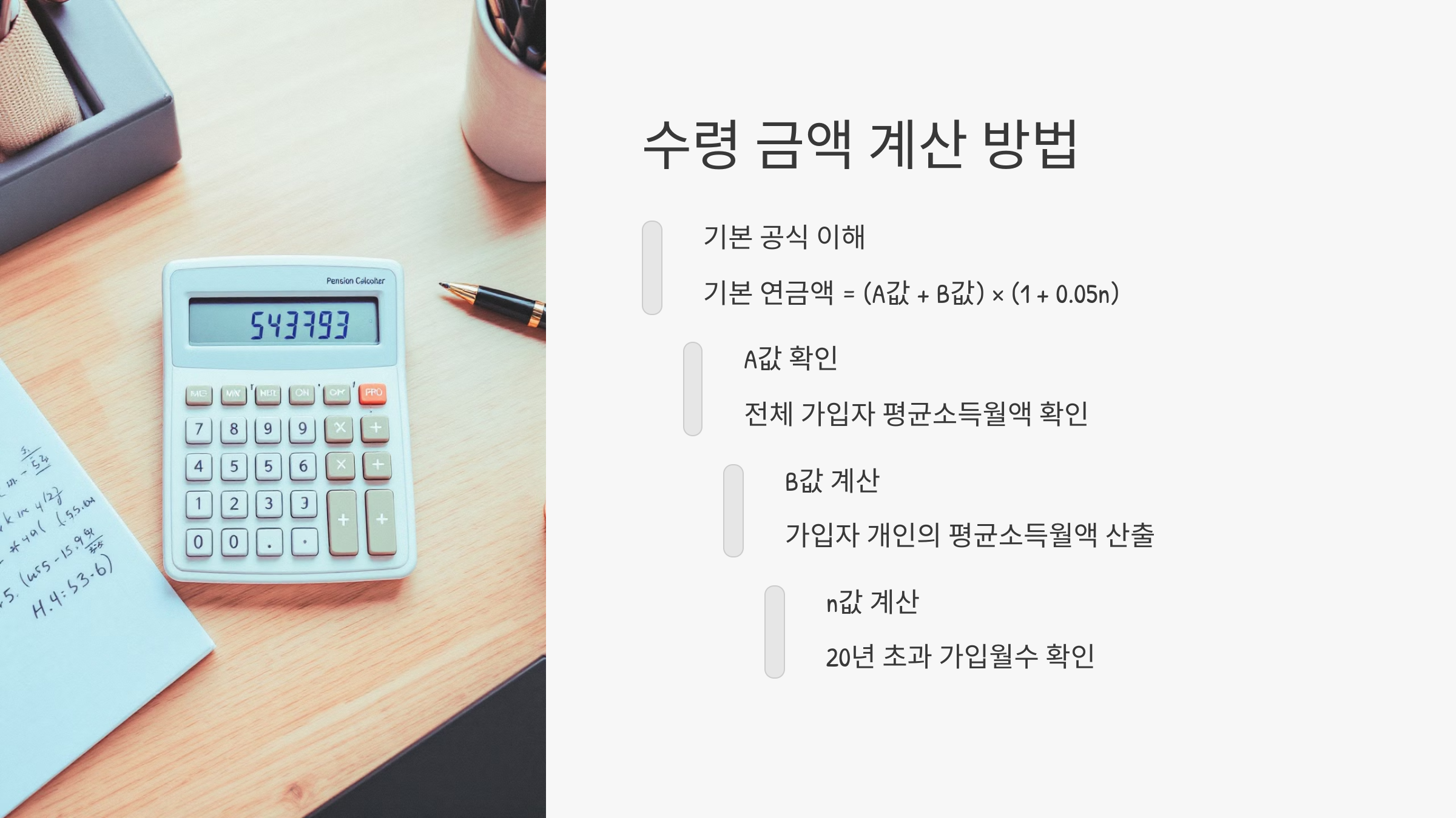 수령 금액 계산 방법 노령연금에서 가장 궁금한 부분이 바로 “나는 얼마 받을 수 있지?”라는 점이에요. 실제로 받는 금액은 가입기간, 납부금액, 평균소득, 출생연도에 따라 달라지기 때문에 사람마다 다르게 책정돼요. 국민연금은 단순 정액이 아니라 계산 공식에 따라 산출돼요.