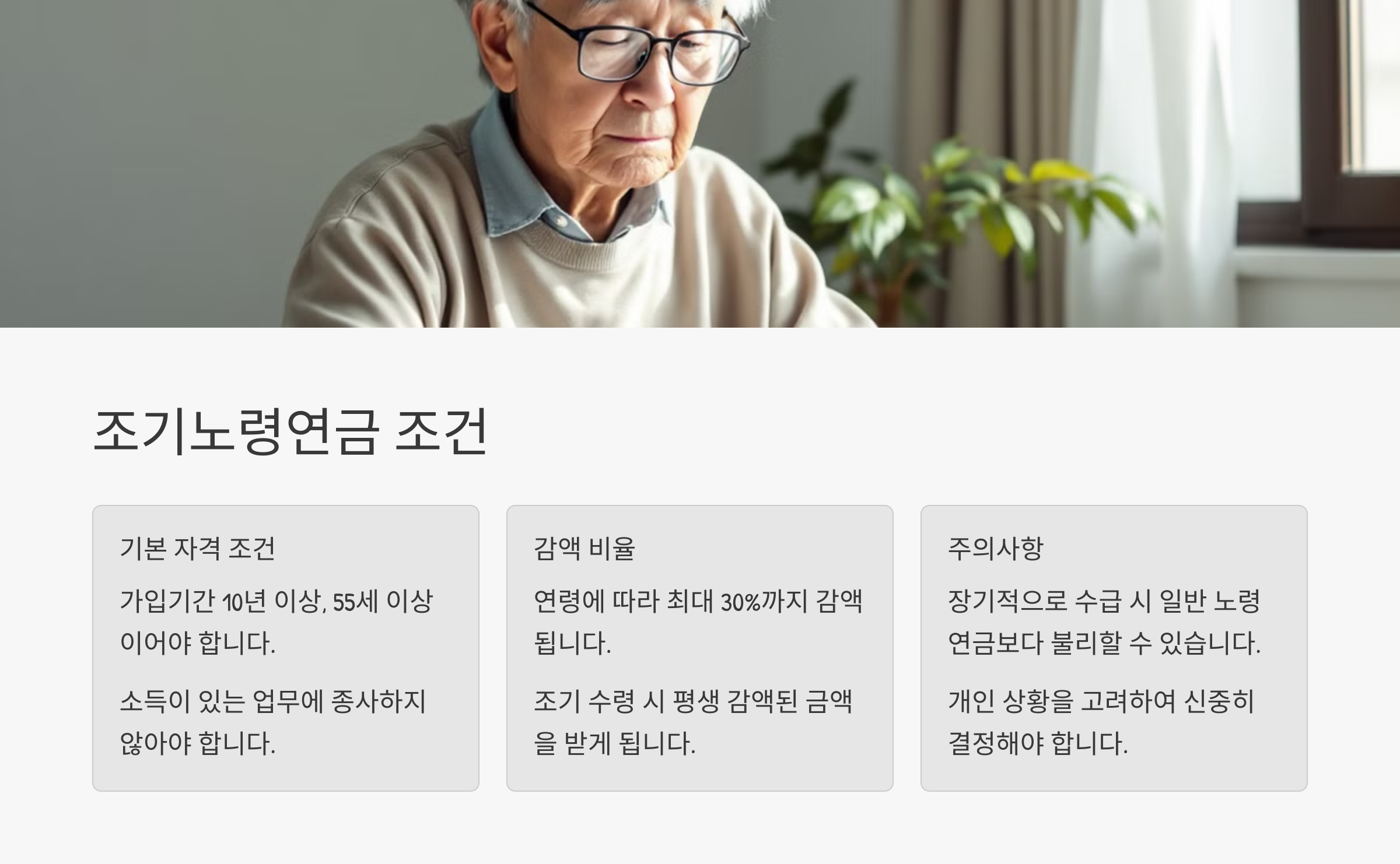 조기노령연금 조건 조기노령연금은 말 그대로 일반적인 연령보다 먼저 연금을 받는 제도예요. 일찍 은퇴하거나 소득이 끊긴 사람들을 위해 마련된 제도죠. 단, 조기에 받는 만큼 연금액은 줄어든다는 점이 가장 큰 특징이에요.