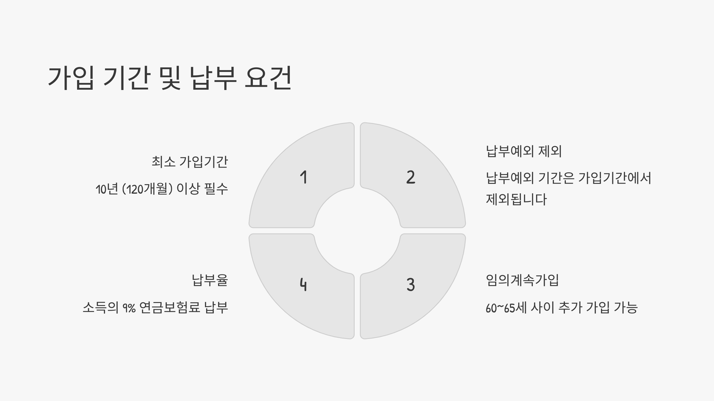 구분 기준 설명 가입 기간 10년 이상 120개월 이상 납부해야 함 납부 방식 직장 or 지역가입 직장은 자동공제, 지역은 자진신고 추납 제도 선택 가능 과거 미납 기간 추가 납부 가능 실업 기간 납부 제외 해당 기간은 가입기간에서 제외 국민연금공단 홈페이지에서 내 가입 기간을 확인하고, 부족한 경우에는 추납을 통해 보완해보세요. 특히 은퇴 전 몇 년은 정말 중요한 시기니까 꼼꼼히 챙기면 좋아요! 📆