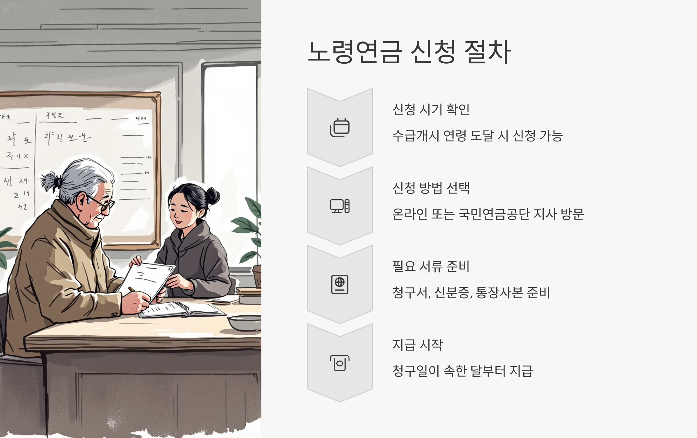 노령연금을 받기 위한 신청 절차는 생각보다 복잡하지 않아요. 기본적으로 '직접 신청'이 필요하다는 점만 기억하면 돼요. 자동으로 지급되진 않기 때문에, 수급 가능한 나이가 되면 꼭 본인이 챙겨야 해요!
