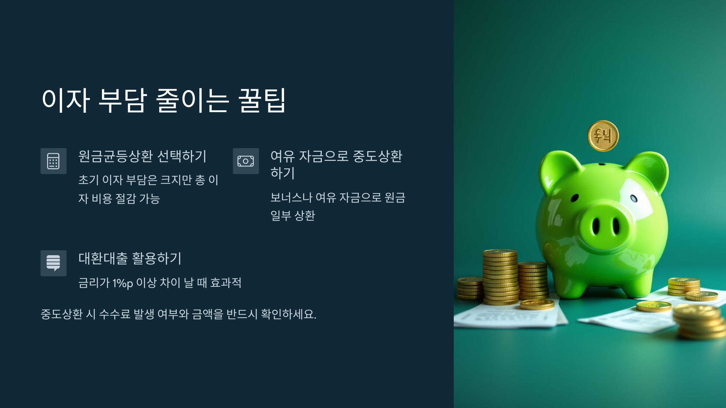 세 번째는 ‘중도상환 수수료 체크’예요. 대부분 3년 이내에는 중도상환 수수료가 발생해요. 그래서 목돈이 들어올 예정이라면 중도상환 수수료 없는 상품을 선택하는 게 좋아요. 또는 일부 은행은 일정 금액까지는 수수료 없이 상환 가능해요.
