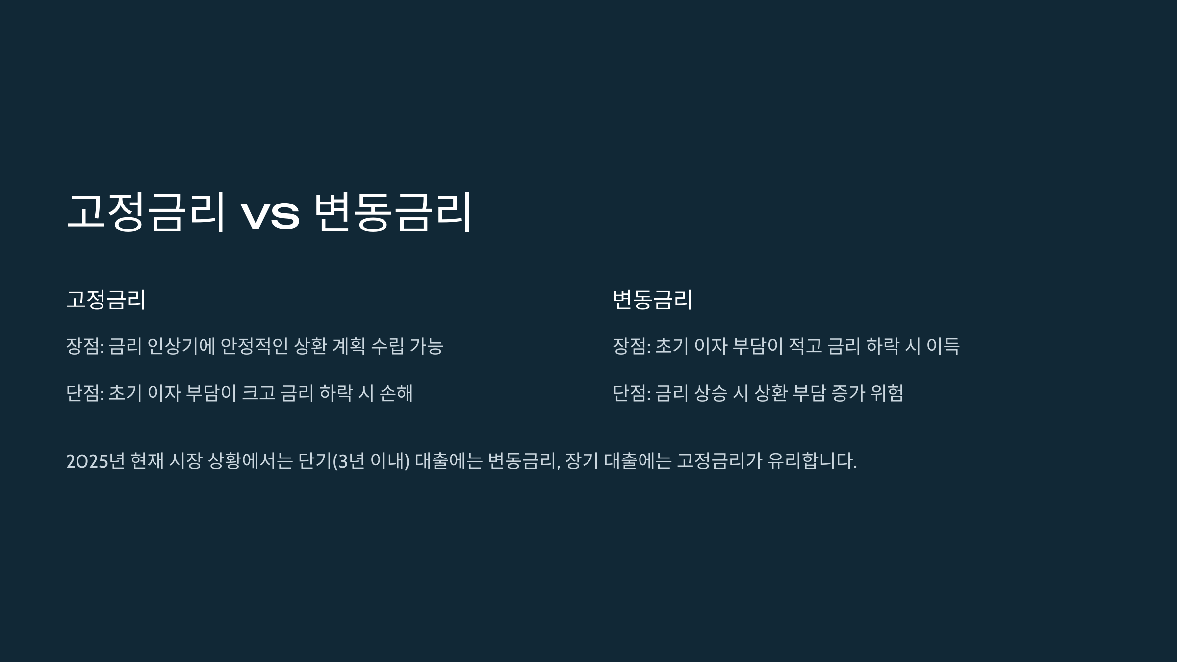 그럼 어떤 선택이 좋을까요? 안정적인 직장에 다니고, 앞으로 큰 지출 계획이 없다면 고정금리를 추천해요. 반면 금리에 민감하고, 단기 상환 계획이 있거나 앞으로 수입이 증가할 것으로 예상된다면 변동금리도 괜찮은 선택이에요.