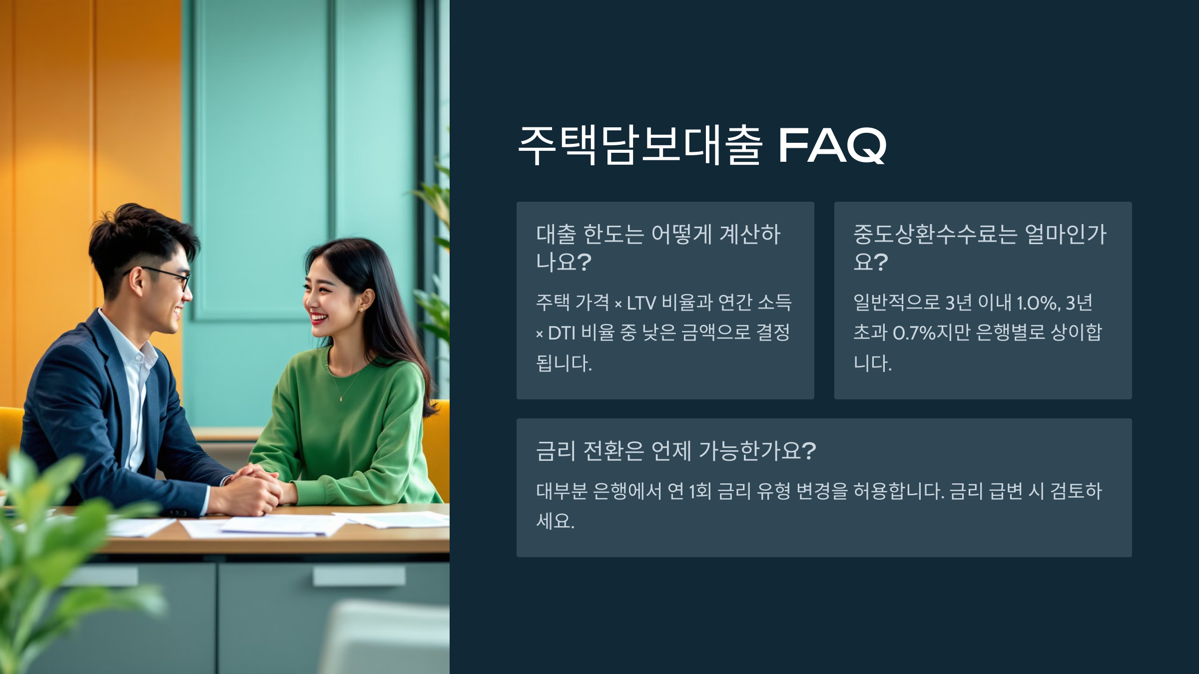 이처럼 주택담보대출은 단순히 '얼마 빌릴 수 있느냐'가 아니라 '어떤 조건으로, 얼마의 이자를 내느냐'까지 포함해 종합적인 판단이 필요한 금융 상품이에요. 특히 장기 대출이므로 신중한 접근이 중요해요.