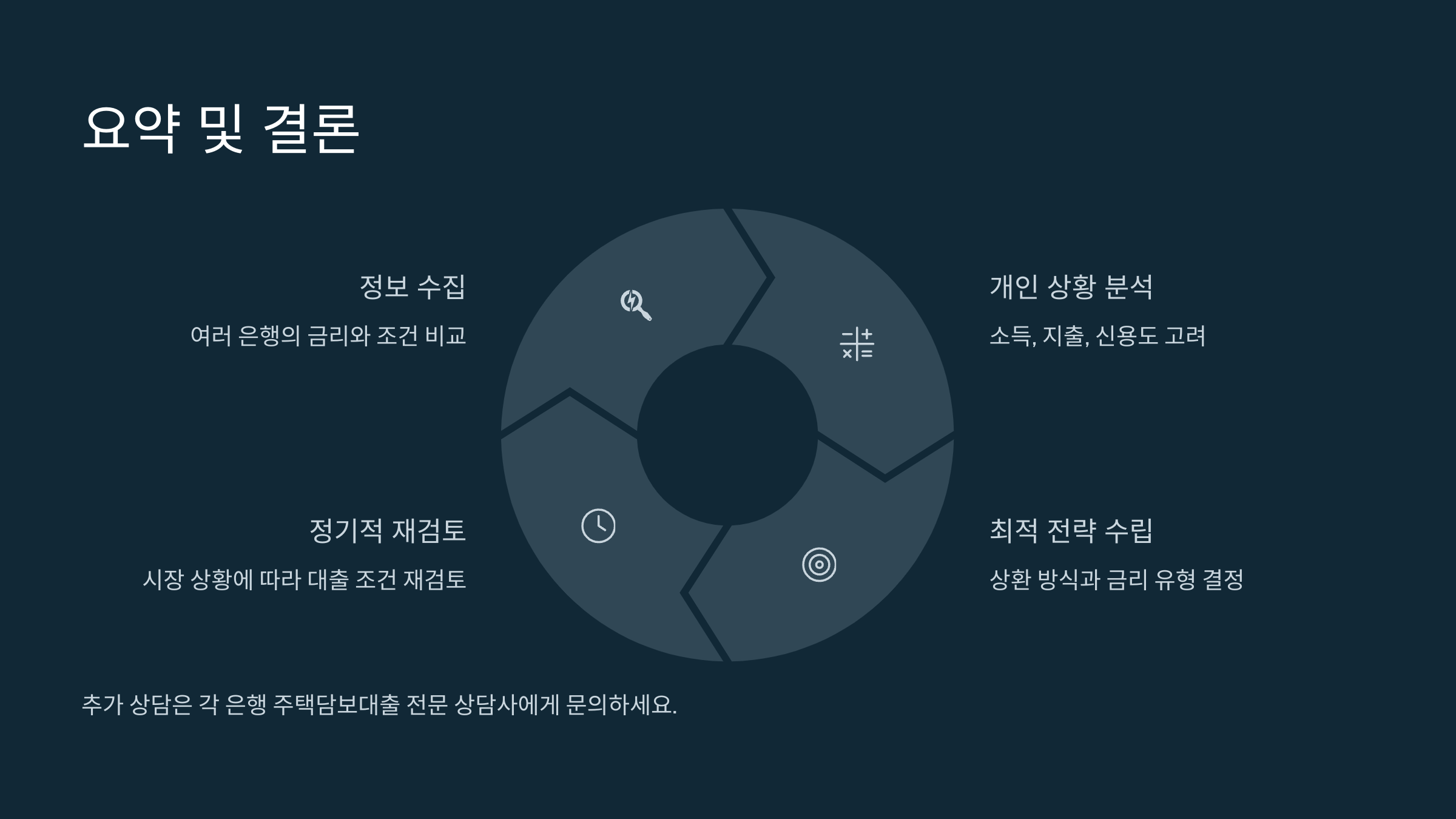 실제로 대출 심사 시 신용점수, 소득, 주택 감정가 등에 따라 금리는 바뀔 수 있어요. 그래서 이런 평균 금리는 참고용으로만 활용하고, 각 은행의 대출 상담을 통해 정확한 조건을 확인하는 게 중요해요!