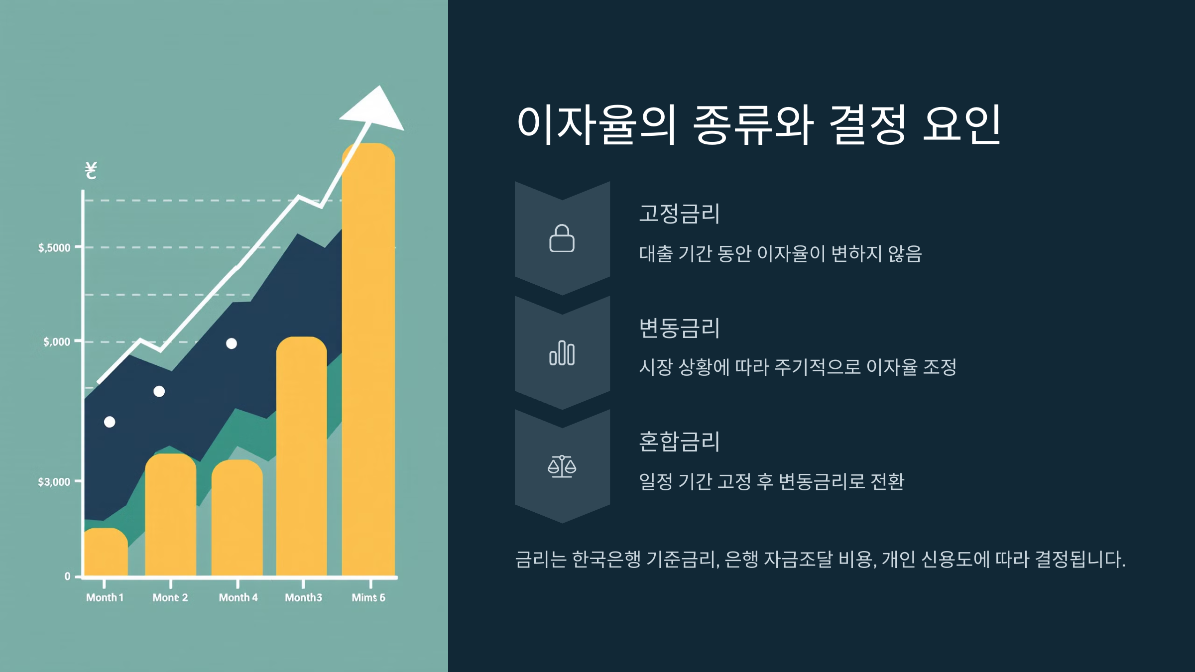 그럼 다음 섹션에서는 금리를 결정짓는 요인과 그 종류에 대해 하나씩 알아볼게요. 고정금리, 변동금리, 혼합형까지 다 다르거든요! 🧾