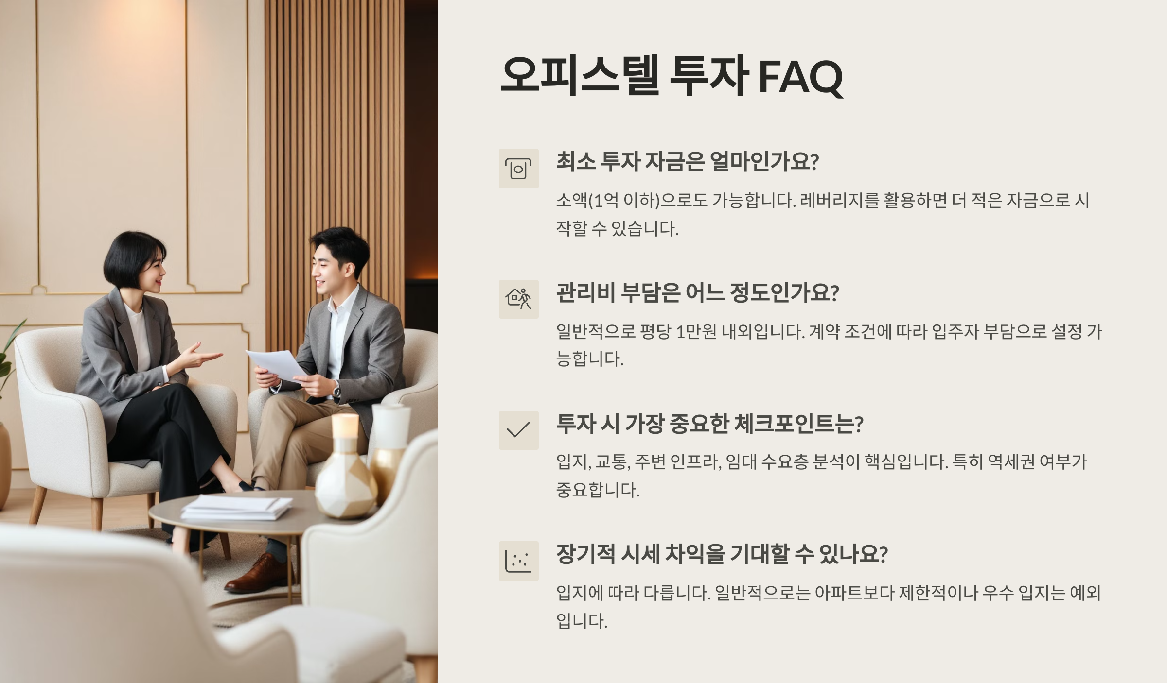 이런 구조 덕분에 공실 위험이 상대적으로 낮고, 꾸준한 월세 수익을 기대할 수 있어서 많은 투자자들에게 ‘소액 투자’ 입문용으로 사랑받고 있어요. 최근 1~2인 가구의 증가, 비혼 인구 증가, 젊은 직장인의 이동 등도 오피스텔 수요를 키우는 중요한 요소랍니다.