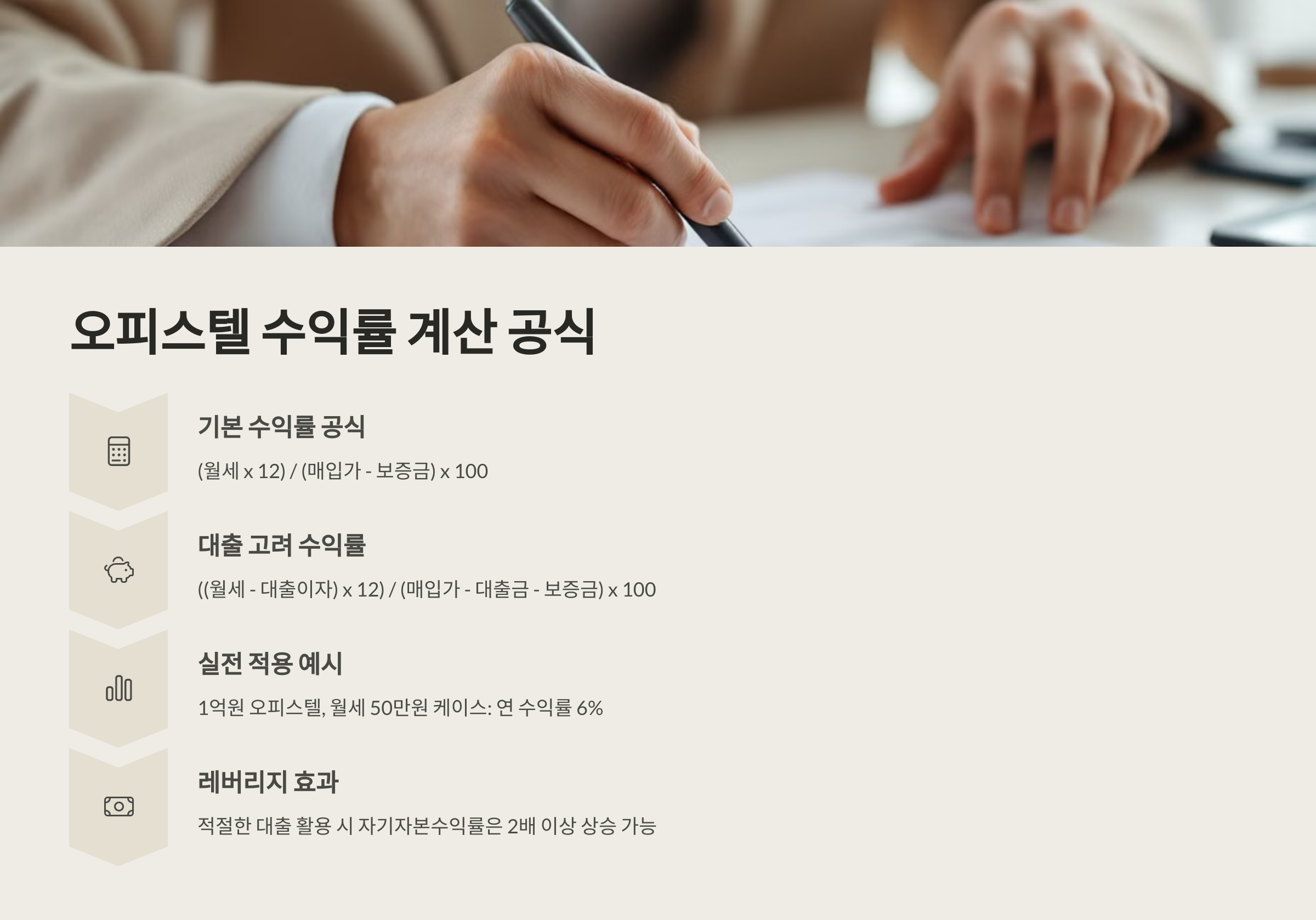 수익률 계산 공식과 실전 적용 오피스텔 투자에서 가장 중요한 건 바로 ‘수익률’이에요. 단순히 매매 가격과 월세만 보는 게 아니라, 여러 요소를 고려해야 정확한 수익률 계산이 가능하죠.